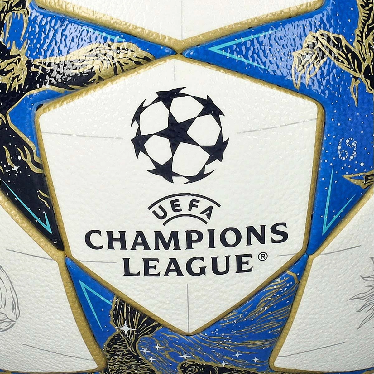 Logo FIFA Quality PRO garantissant la qualité du ballon. Logo de l'UEFA Champions League imprimé.