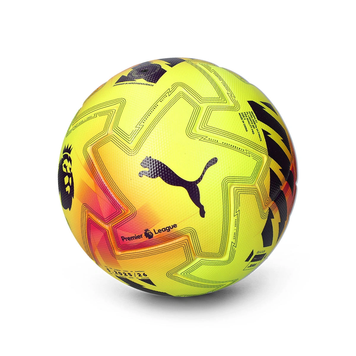 Le Puma Premier League Lights - le ballon qui transforme l'hiver en spectacle - arrive en octobre 2025 pour illuminer les matchs d'hiver de la ligue la plus spectaculaire du monde. Inspiré du modèle Orbita 3, ce ballon se distingue par son gradient de volt frappant avec des touches de jaune intense, accompagné de détails violets foncés et roses qui reflètent l'énergie et le rythme de la Premier League.