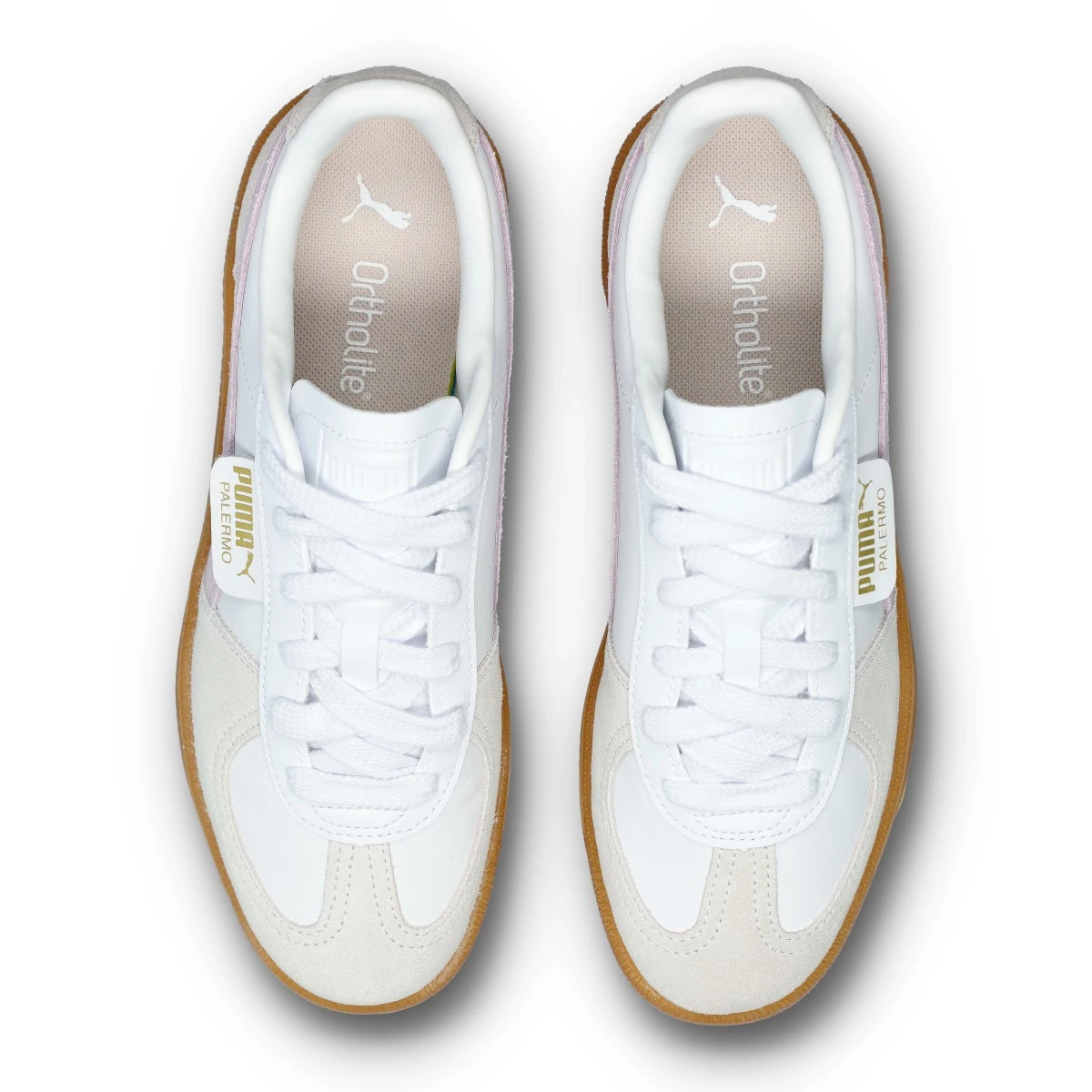 La Palermo, fraîchement sortie des archives PUMA. Ce modèle classique, que l'on voit souvent dans les tribunes des stades, présente un design qui s'appuie sur l'héritage du football tout en séduisant les sneakerheads et les fashionistas d'aujourd'hui. Cette version a une base en cuir avec des bandes de forme et des empiècements en daim.