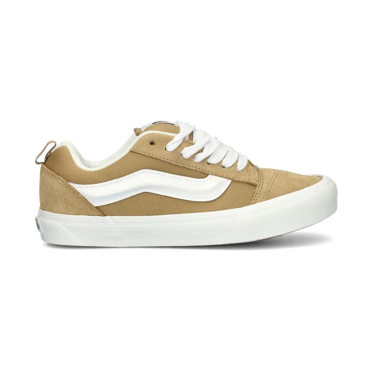 La Knu Skool est un modèle réédité des années 90. Vans conserve l'esthétique "Off The Wall" avec son emblématique Sidestripe présentant la nouveauté d'un matelassage 3D, mis en valeur par un look large et épais. Elle présente une silhouette basse, une empeigne en daim durable et un design avec une languette et un col rembourrés.