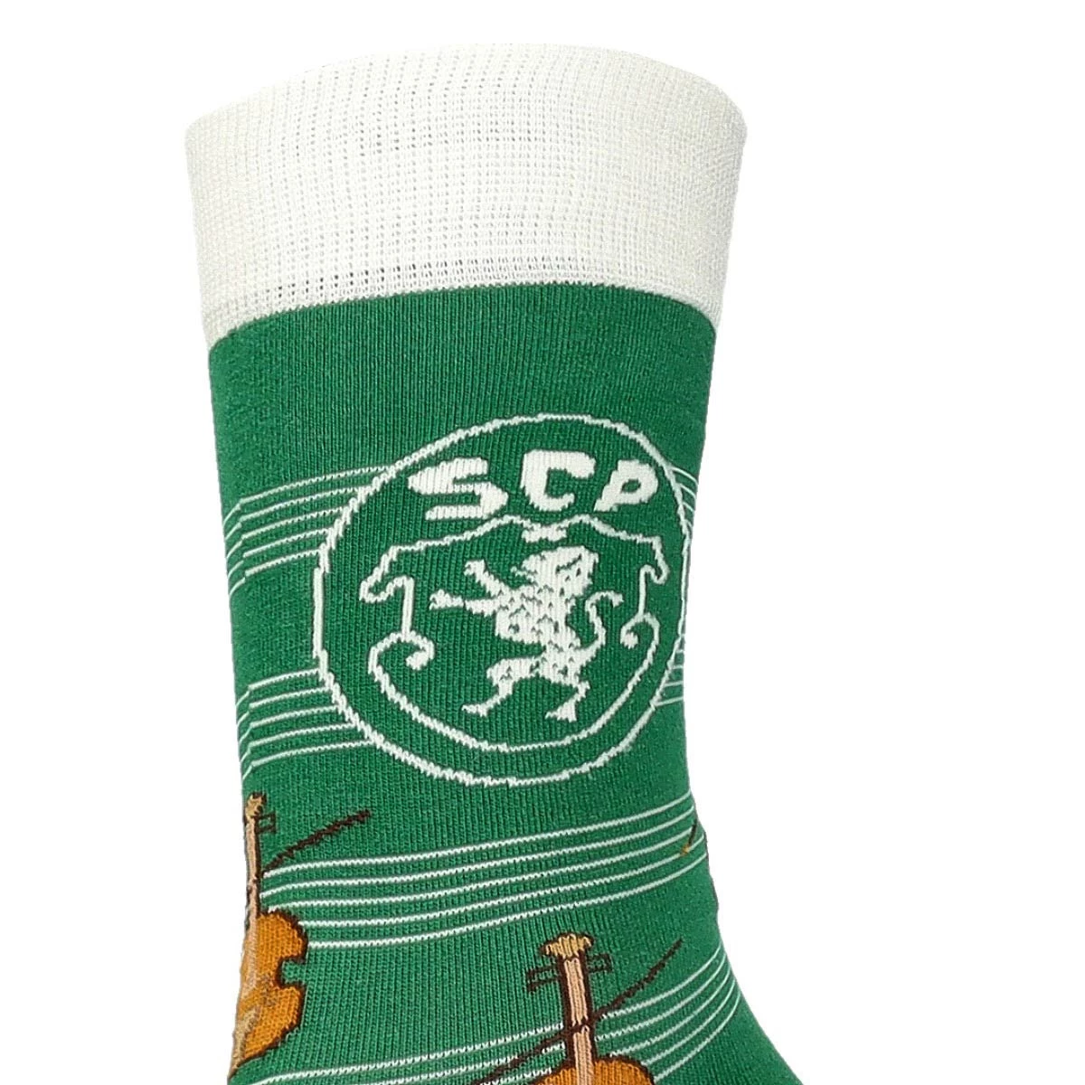 Chaussettes du Sporting de Portugal avec une impression de violon faisant référence aux joueurs qui ont joué pour l'équipe.