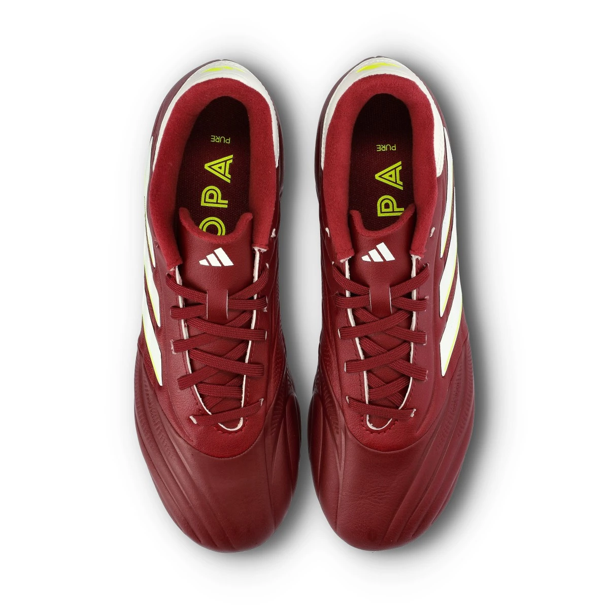 Chaussures de football adidas Copa Pure 2 League FG. Chaussures en cuir synthétique à utiliser sur les terrains en gazon naturel. Chaussures haut de gamme en Shadow Red-Ftwr White-Team Solar Yellow.