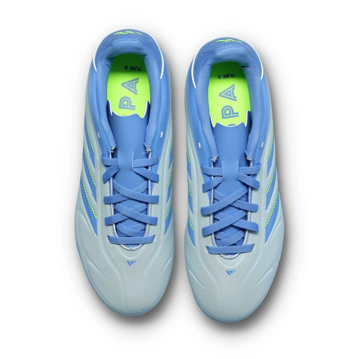 Chaussures de football adidas Copa Pure III Club FG/MG pour enfants. Coloris Halo Blue-Blue Fusion-Lucid Lemon.
