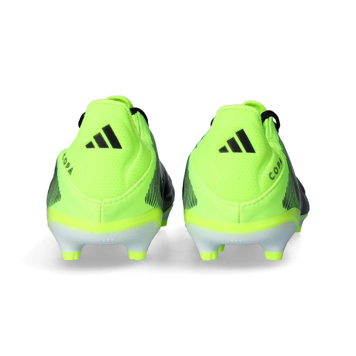 Chaussures de football adidas Copa Pure III Elite FG/MG pour enfant. Chaussures en cuir conçues pour jouer sur terrains en gazon naturel ou moquette. Modèle haut de gamme en coloris Core Black-White-Lucid Lemon, idéal pour les joueurs classiques.