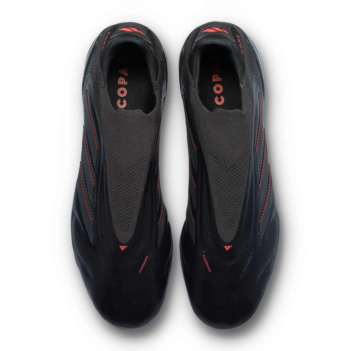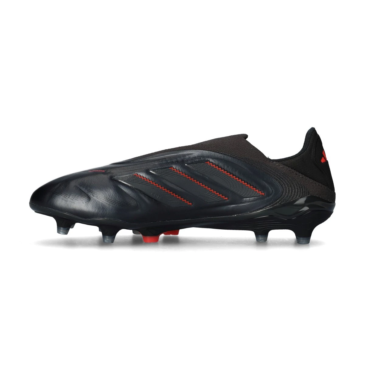 Chaussures de football adidas Copa Pure III Elite LL FG. Chaussures en cuir sans lacets pour les terrains en gazon naturel. Chaussures haut de gamme en Core Black-Carbon-Lucid Red pour les joueurs classiques.