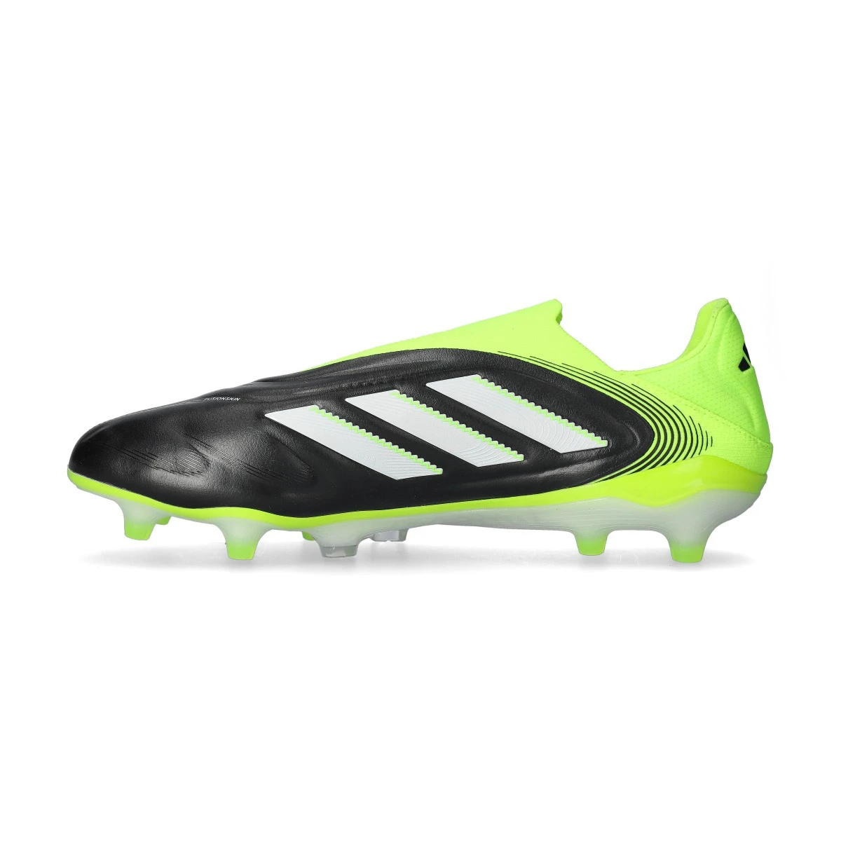 Chaussures de football adidas Copa Pure III Elite LL FG. Chaussures en cuir sans lacets, conçues pour terrains en gazon naturel. Chaussures haut de gamme en coloris Core Black-White-Lucid Lemon pour les joueurs classiques.