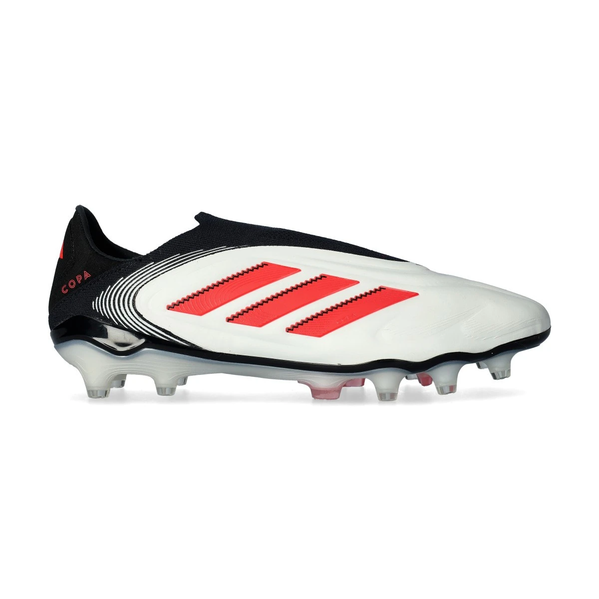 Chaussures de football adidas Copa Pure III Elite LL FG. Chaussures en cuir sans lacets pour les terrains en gazon naturel. Chaussures haut de gamme en White-Lucid Red-Core Black pour les joueurs classiques.