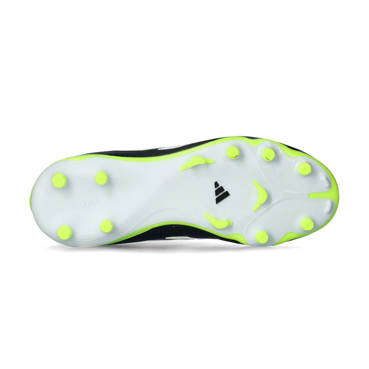 Chaussures de football adidas Copa Pure III League FG/MG pour enfants. Chaussures en cuir synthétique pour une utilisation sur des terrains en gazon naturel et en gazon artificiel de deuxième génération. Chaussures haut de gamme en Core Black-White-Lucid Lemon pour les joueurs classiques.