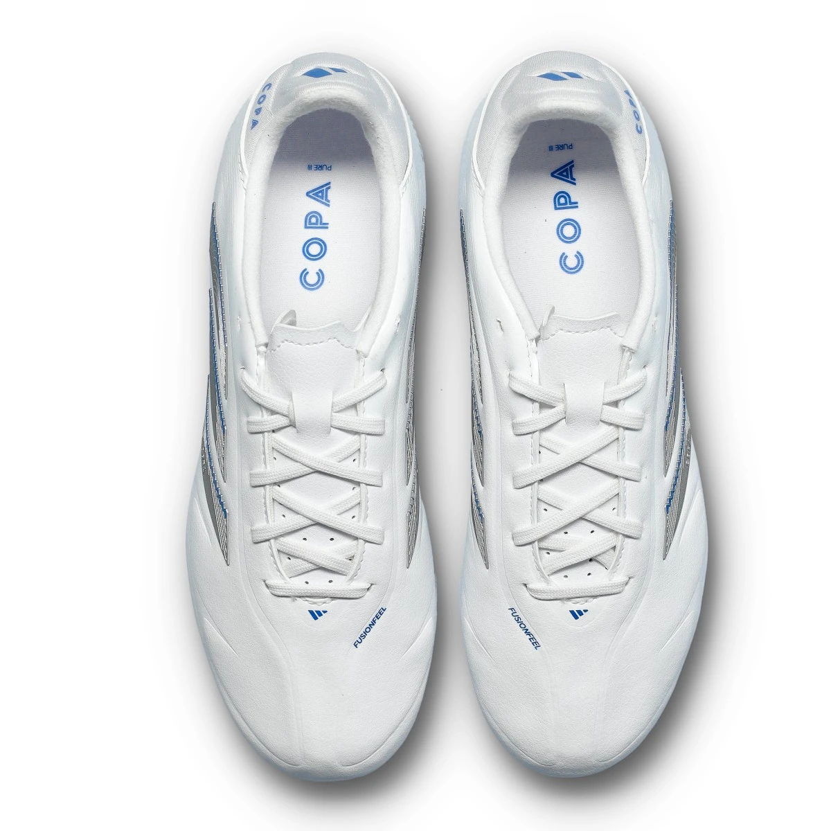 Chaussures de football adidas Copa Pure III League FG/MG pour enfants. Chaussures en cuir synthétique à utiliser sur les terrains naturels et les terrains artificiels de deuxième génération. Chaussures haut de gamme en blanc-argent-métal-royal brillant pour les joueurs classiques.
