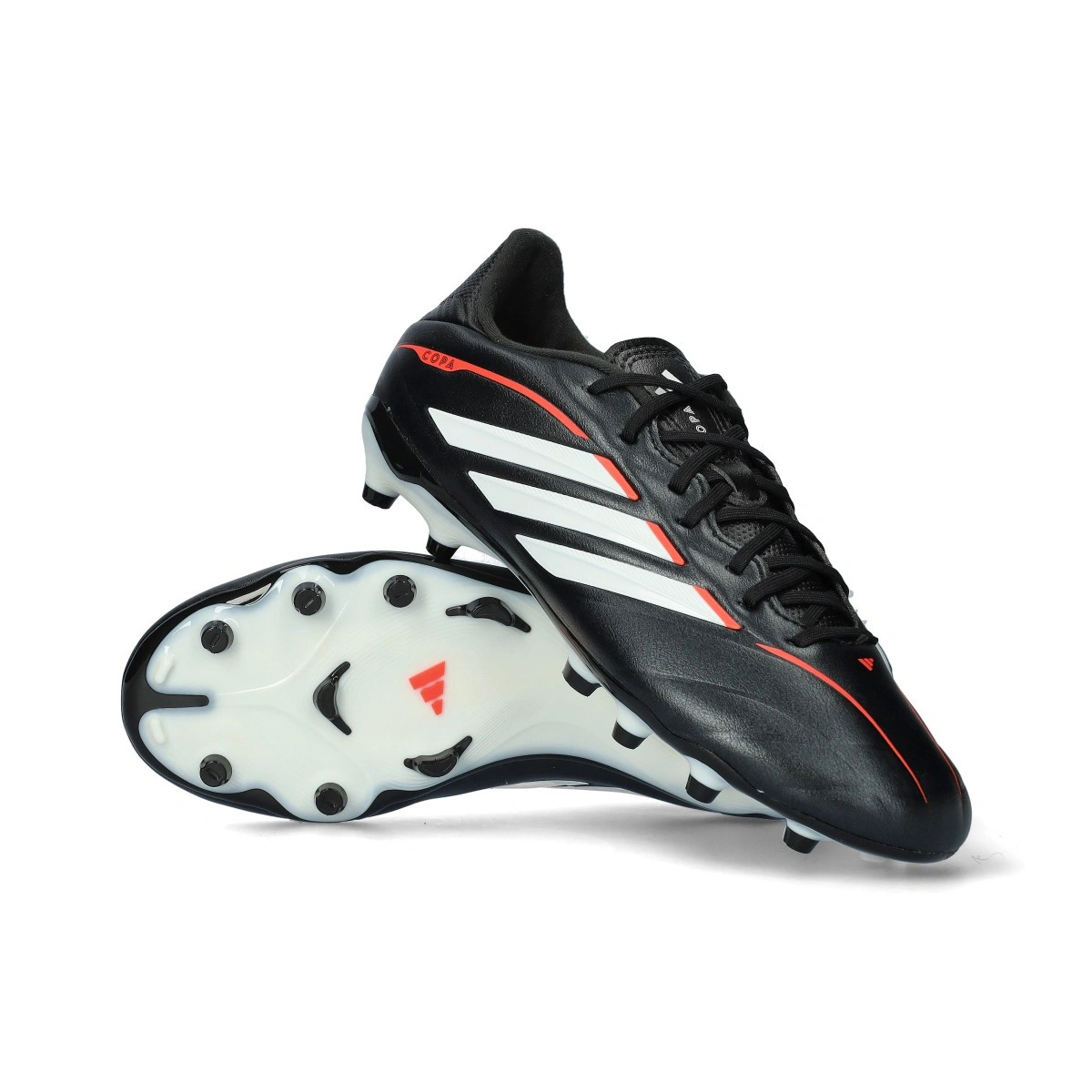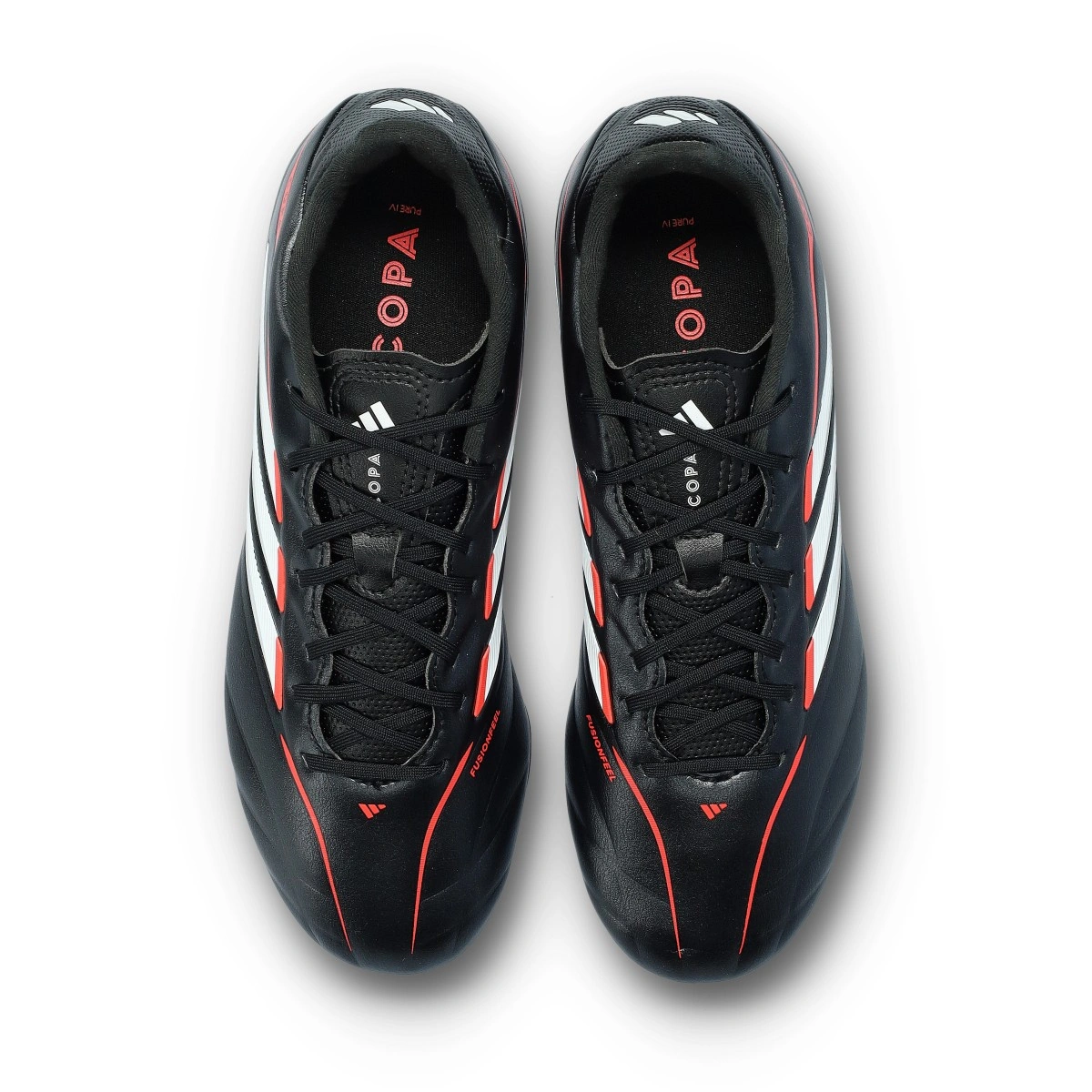 Chaussures de football adidas Copa Pure IV League FG pour enfant. Chaussures en cuir synthétique à utiliser sur terrains en gazon naturel. Chaussures haut de gamme en couleur Core Black-White-Lucid Red pour joueurs classiques.