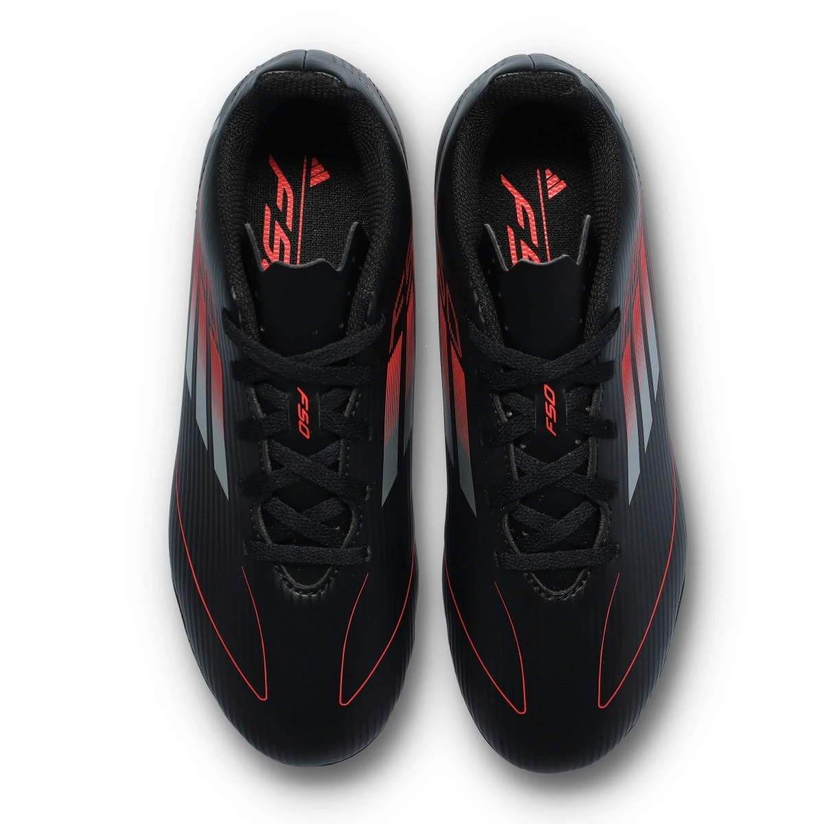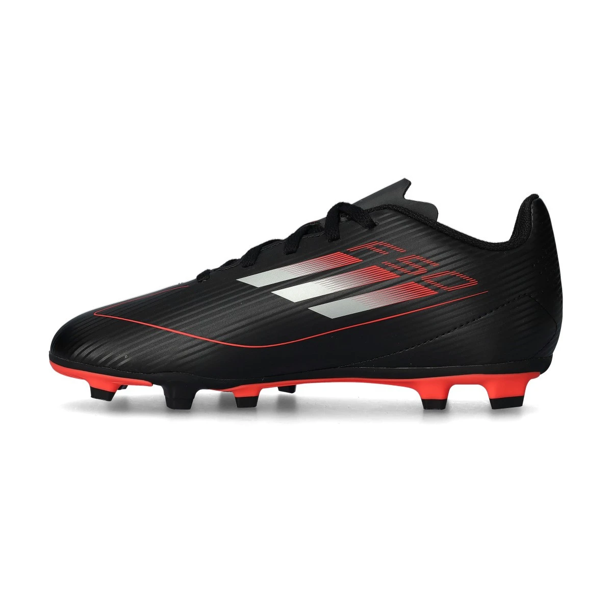 Chaussures F50 Club FG/MG d'adidas en coloris Core Black-Iron Met-Lucid Red pour les enfants. Chaussure de base pour les terrains en gazon naturel.