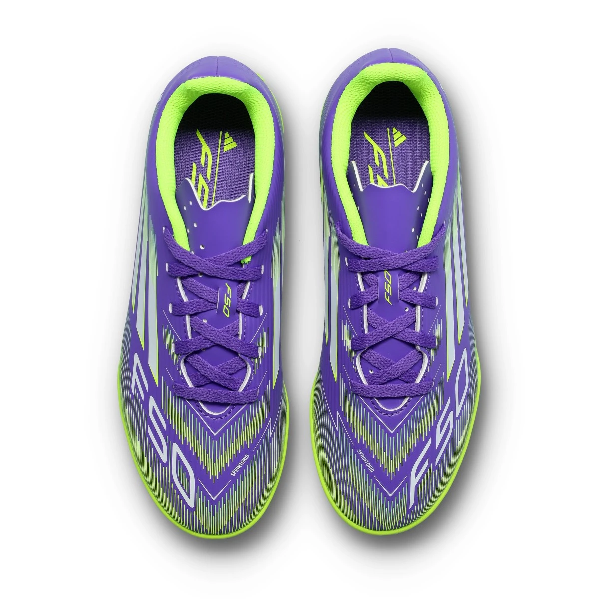 Chaussure de football F50 Club Turf pour enfant en coloris Purple Rush-White-Lucid Lemon. Chaussure à lacets avec semelle Turf, idéale pour les terrains en moquette ou en gazon artificiel.