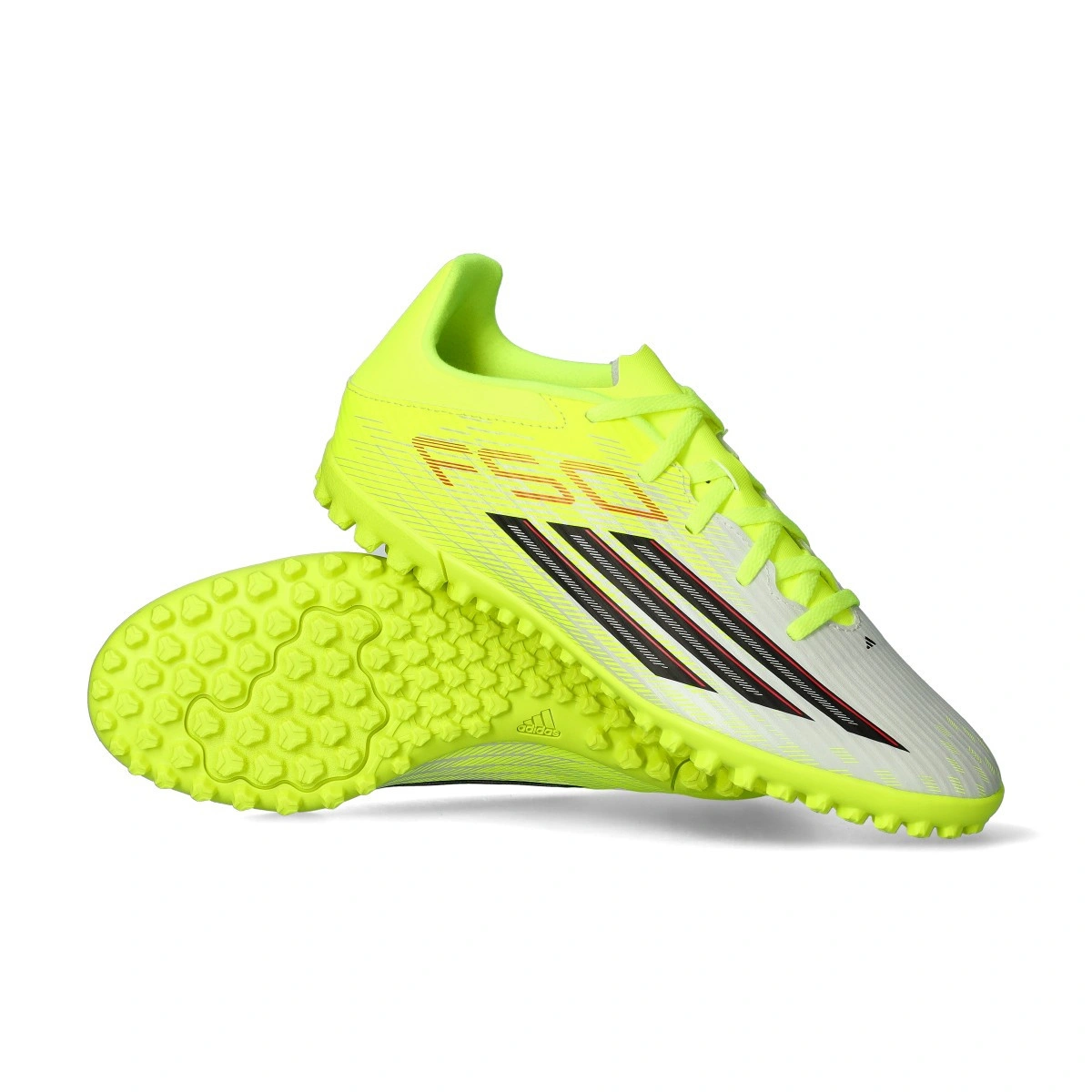 Chaussure F50 Club Turf de la marque adidas en couleur Team Solar Yellow-Core Black-Lucid Red . Chaussure d'entrée de gamme pour moquette ou terrains de gazon artificiel de deuxième génération.