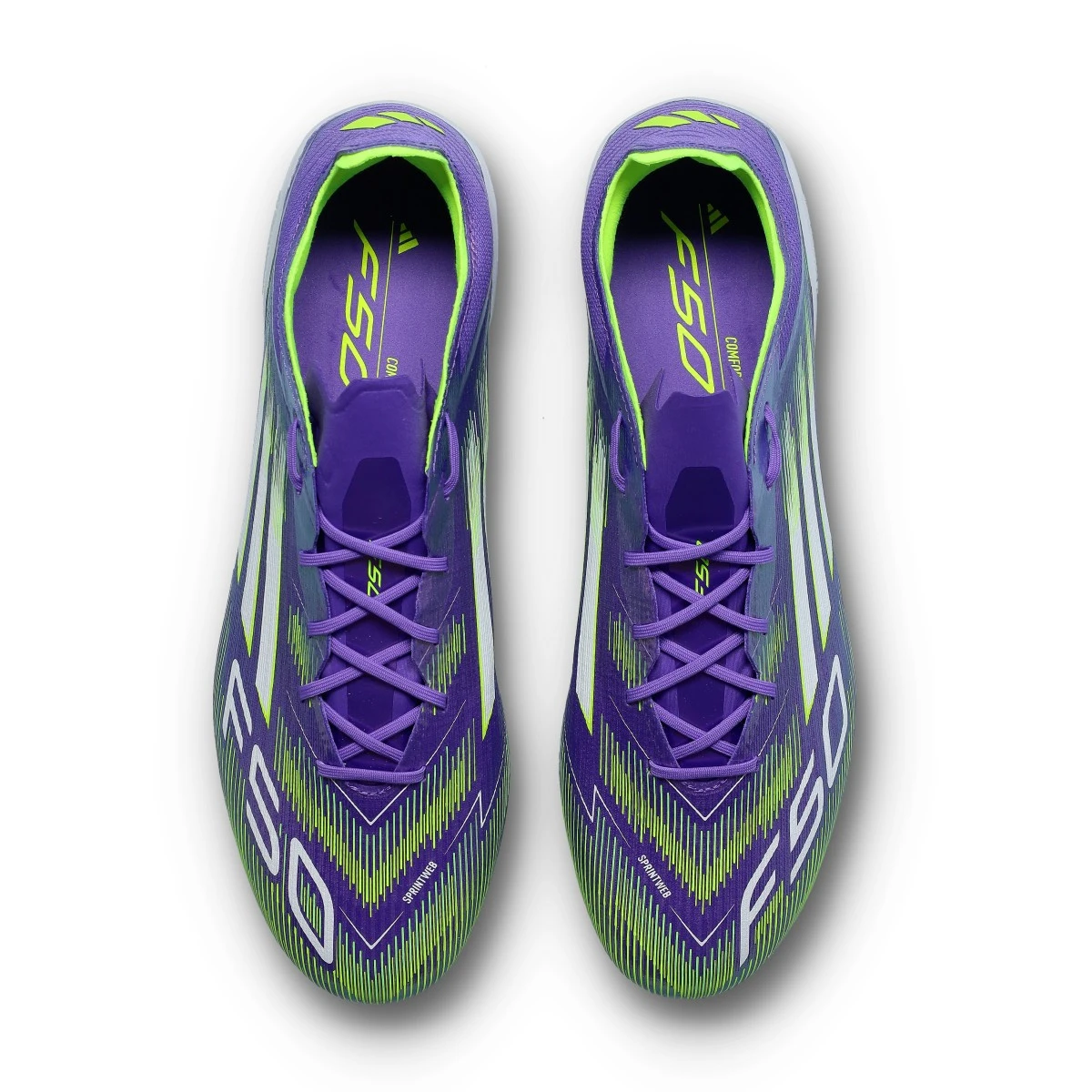 Chaussure F50 Elite AG de la marque adidas pour terrains en gazon artificiel. Chaussure de gamme moyenne avec lacets, en couleur Purple Rush-White-Lucid Lemon.