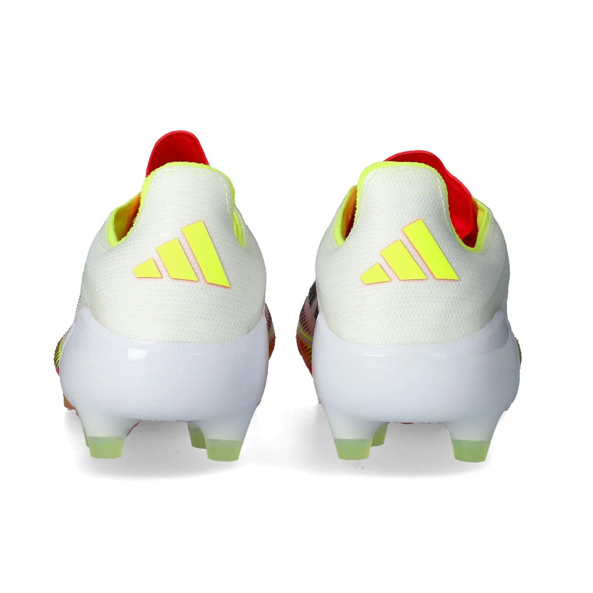 Chaussures adidas F50 Elite AG pour terrains en gazon artificiel en blanc-noir-core-jaune solaire.