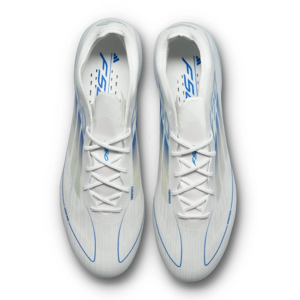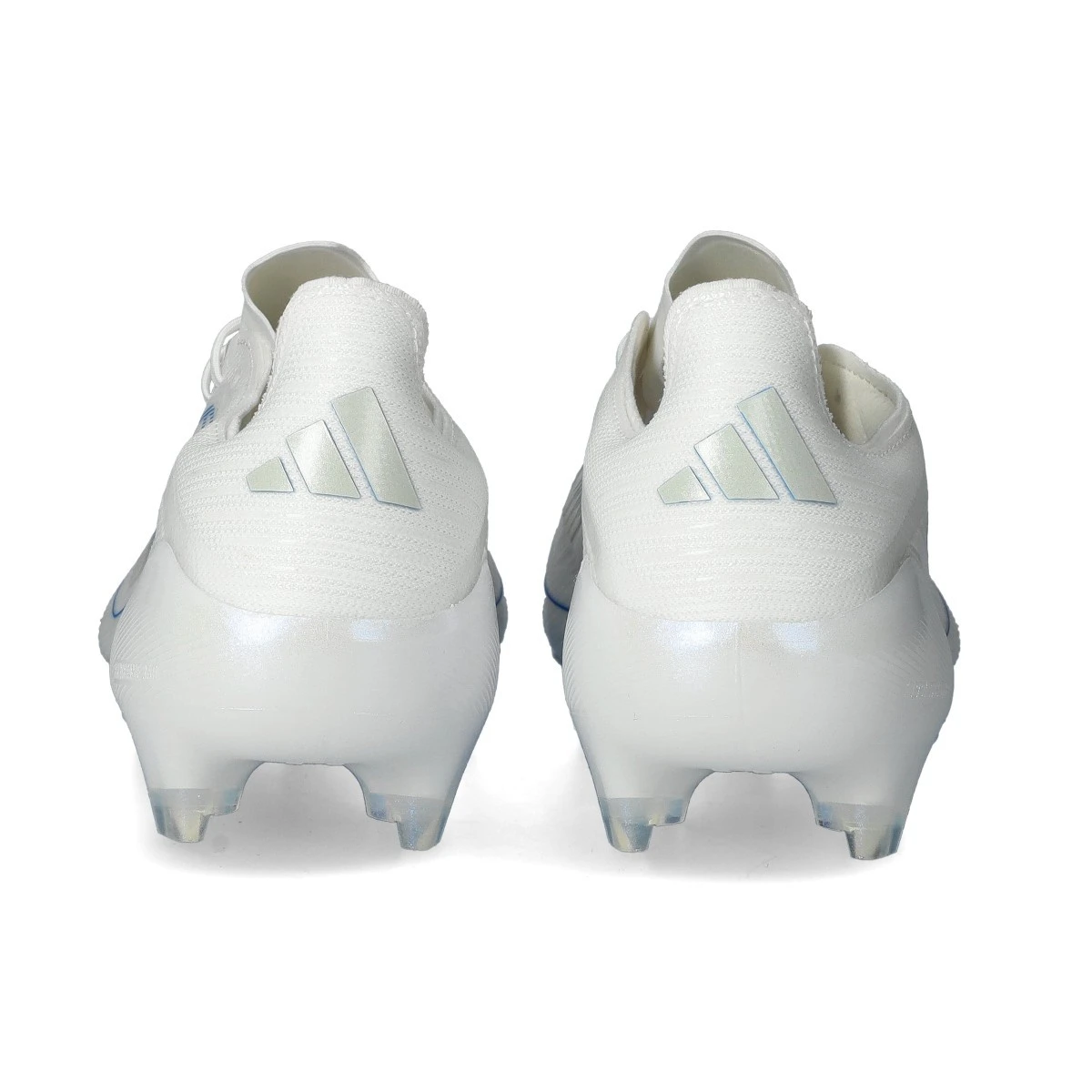 Chaussures de football adidas F50 Elite FG. Chaussures à lacets à utiliser sur des terrains en gazon naturel secs ou humides. Chaussures haut de gamme en couleur Ftwr White-Pearl Met-Ftwr White.