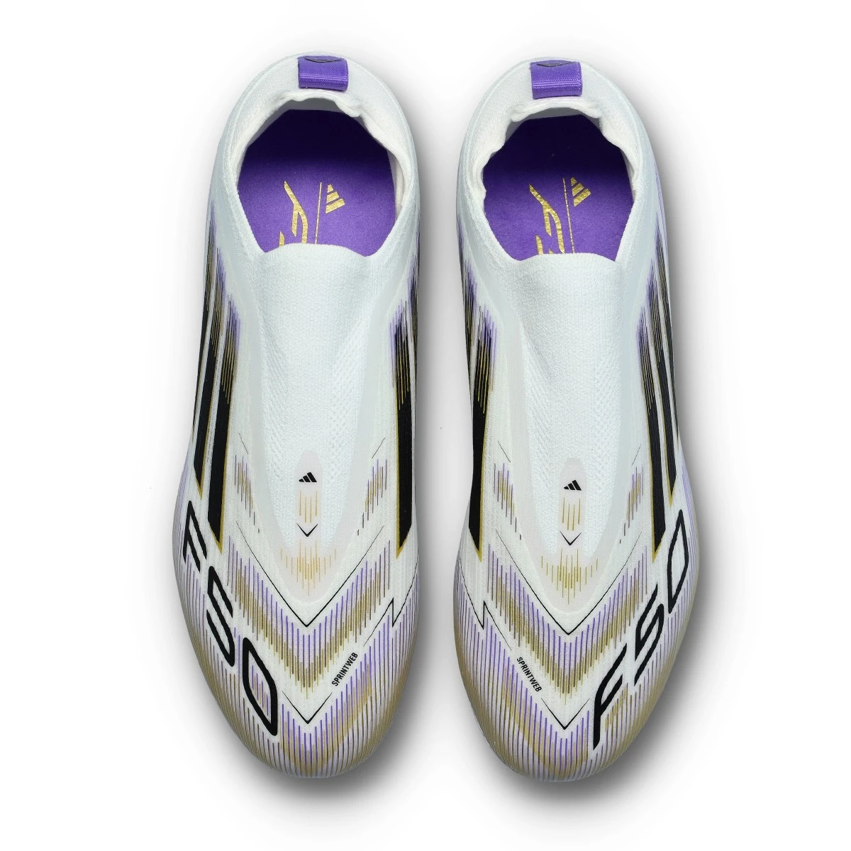 Chaussures de football adidas F50 Elite LL FG. Chaussures à lacets pour une utilisation sur des terrains en gazon naturel secs ou humides. Chaussures haut de gamme en White-Core Black-Gold Met.