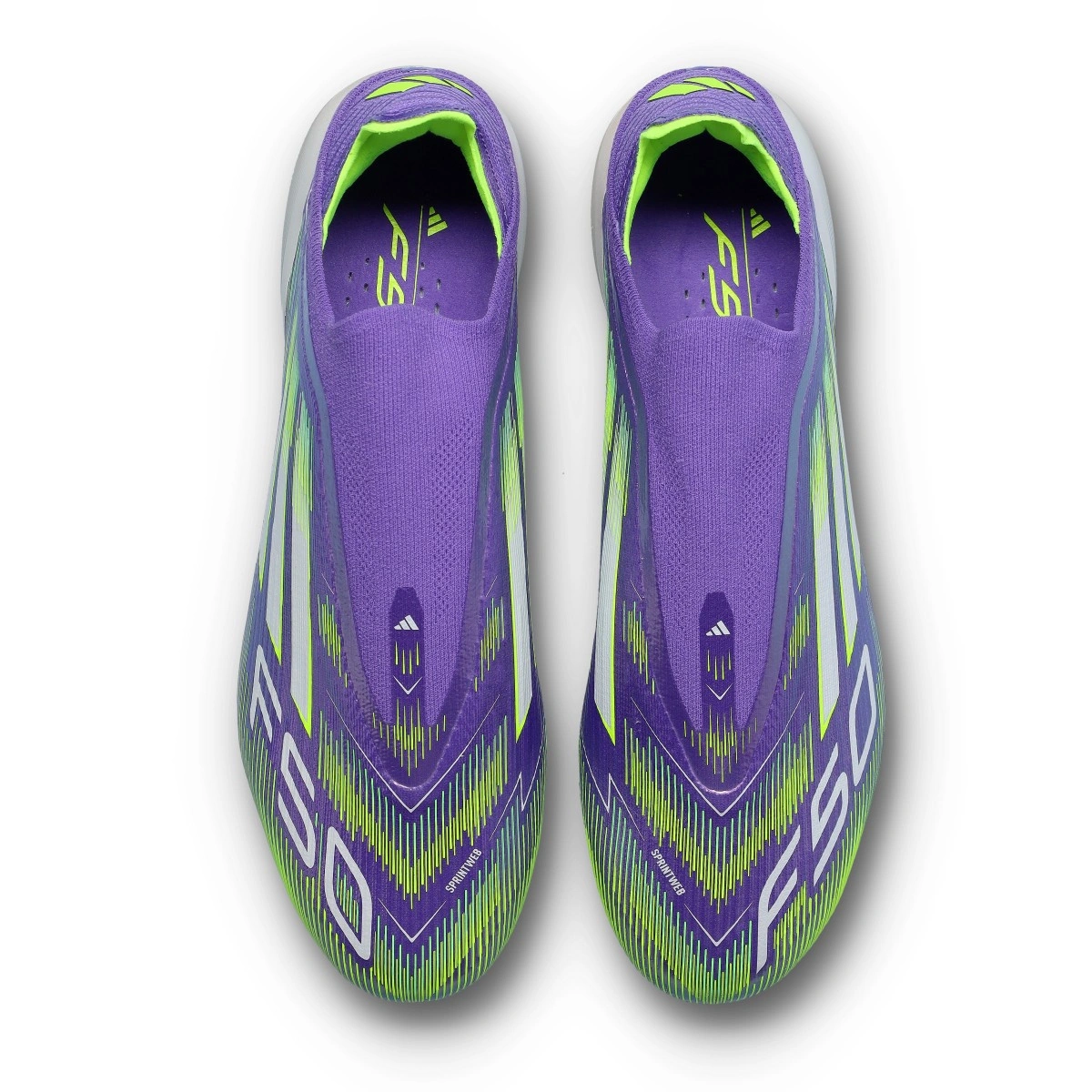 Chaussures en tricot sans lacets, conçues pour les terrains en herbe naturelle humide ou boueux. Modèle haut de gamme, en coloris violet.