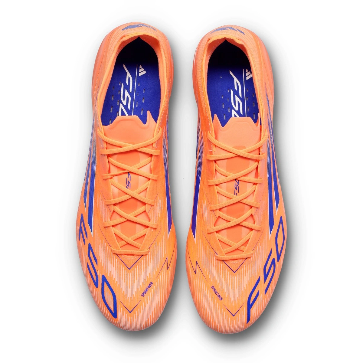 Chaussures F50 Elite SG de la marque adidas, couleur Beam Orange-Lucid Blue-White. Chaussures pour terrains en gazon naturel particulièrement humides.