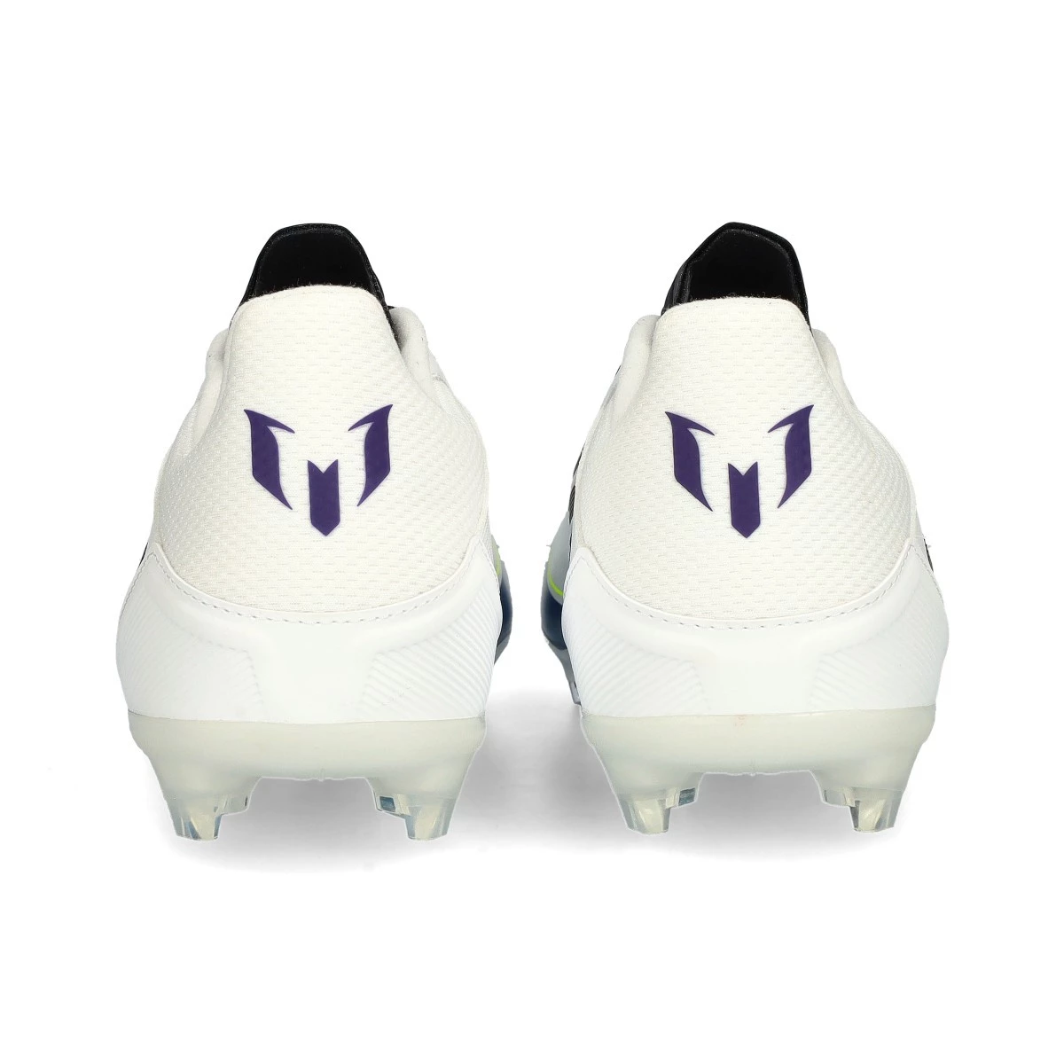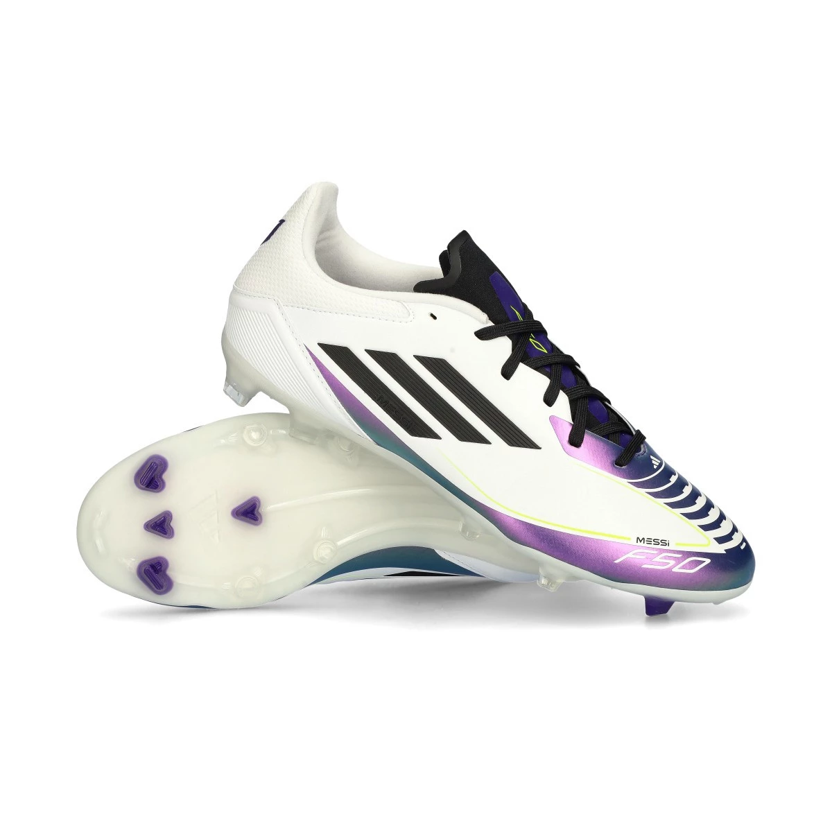 Chaussures F50 League FG/MG Messi de la marque adidas en couleur White-Core Black-Unity Purple.