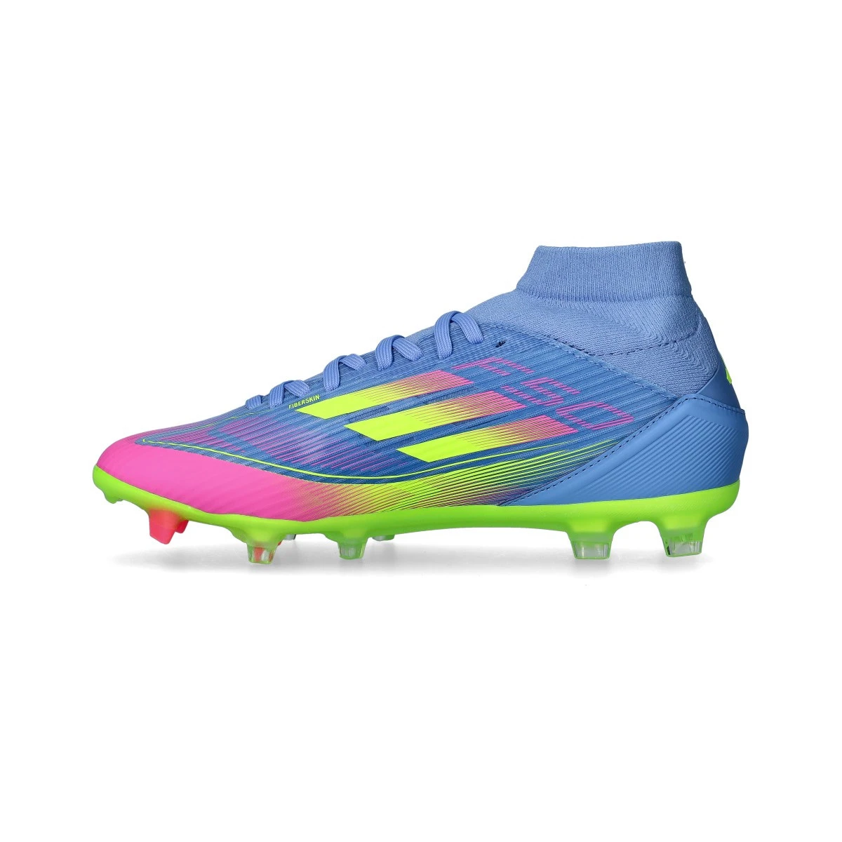 Chaussure F50 League FG/MG Mid pour Femme de la marque adidas en couleur Lucid Pink-Lucid Lemon. Chaussure de milieu de gamme pour terrains en gazon naturel et synthétique de deuxième génération.