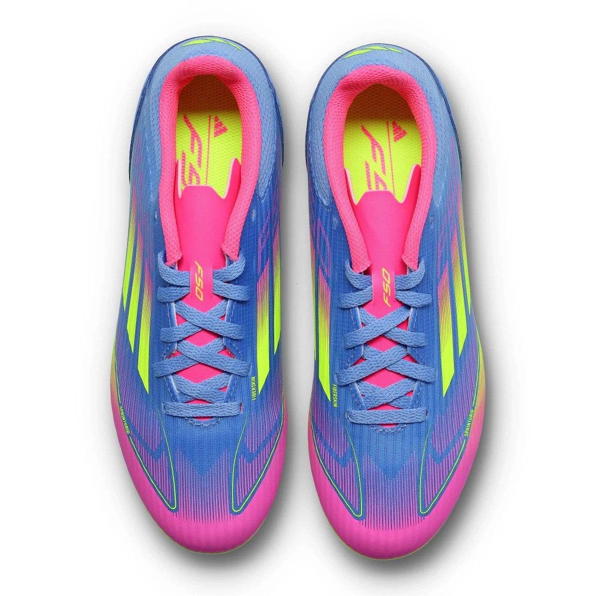 Chaussures pour enfant F50 League FG/MG d'adidas en bleu fusion, citron lucide et rose lucide. Chaussure de base pour les terrains en gazon naturel et en gazon artificiel de deuxième génération.