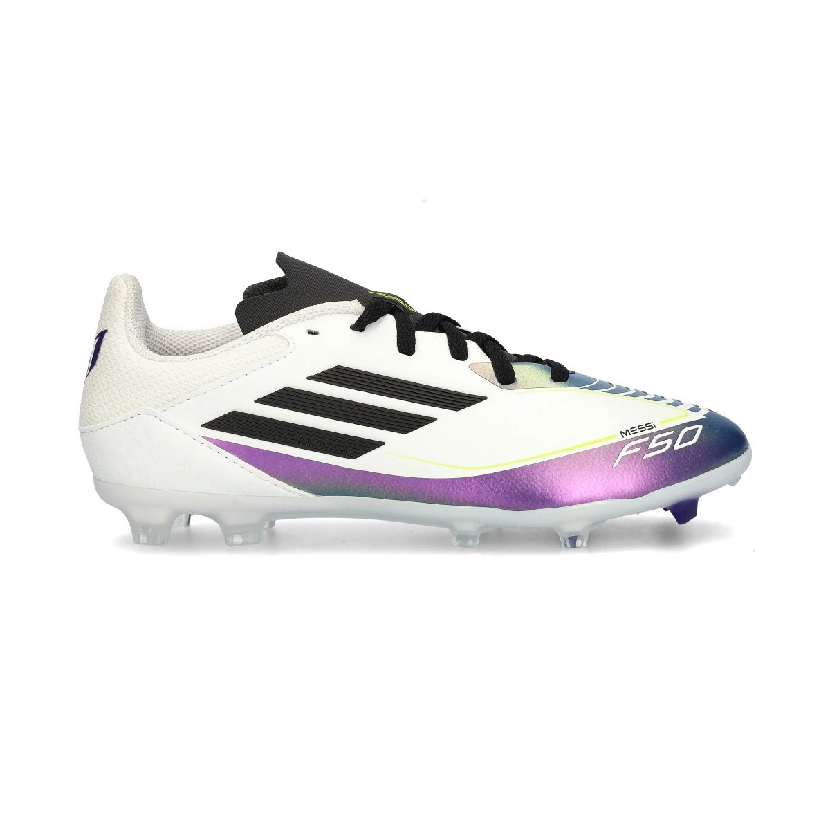 Chaussures F50 League FG/MG Messi de la marque adidas en couleur White-Core Black-Unity Purple pour enfant. Chaussures haut de gamme pour terrains en gazon naturel.