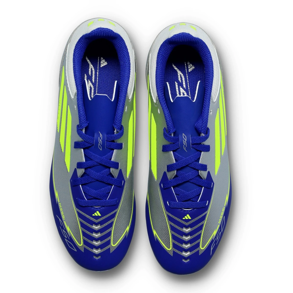 Chaussures F50 League FG/MG Messi pour enfant de adidas en coloris Silver Met-Solar Yellow-Lucid Blue. Chaussure haut de gamme pour les terrains en gazon naturel.
