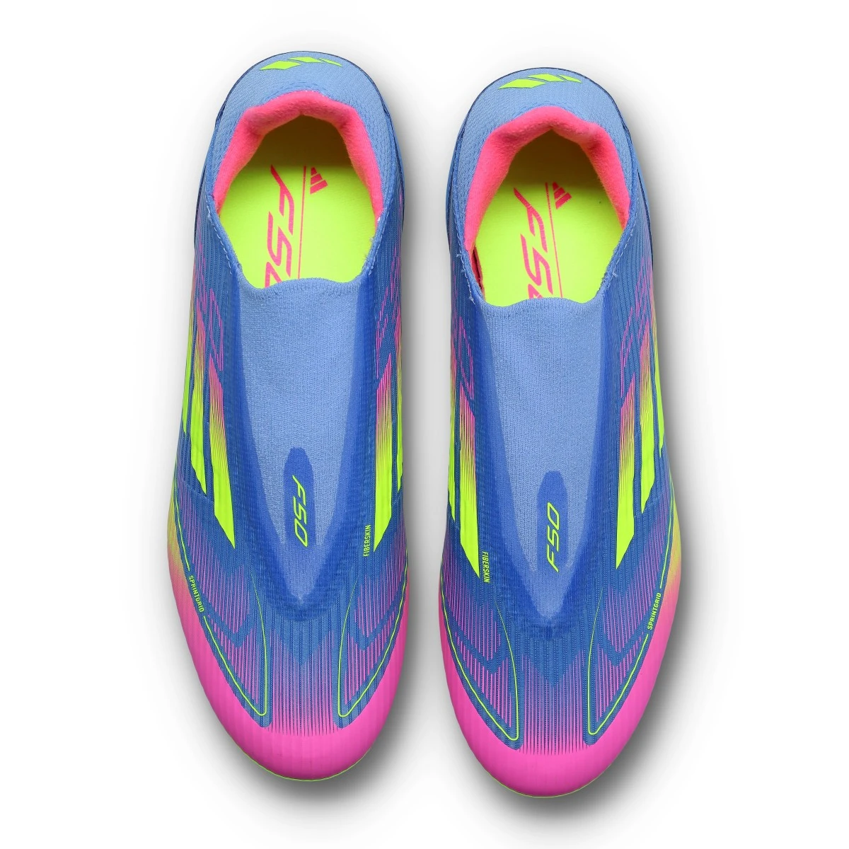 Chaussures F50 League LL FG/MG d'adidas en Bleu Fusion-Lucide Citron-Rose. Chaussure de base pour les terrains en gazon naturel et artificiel.