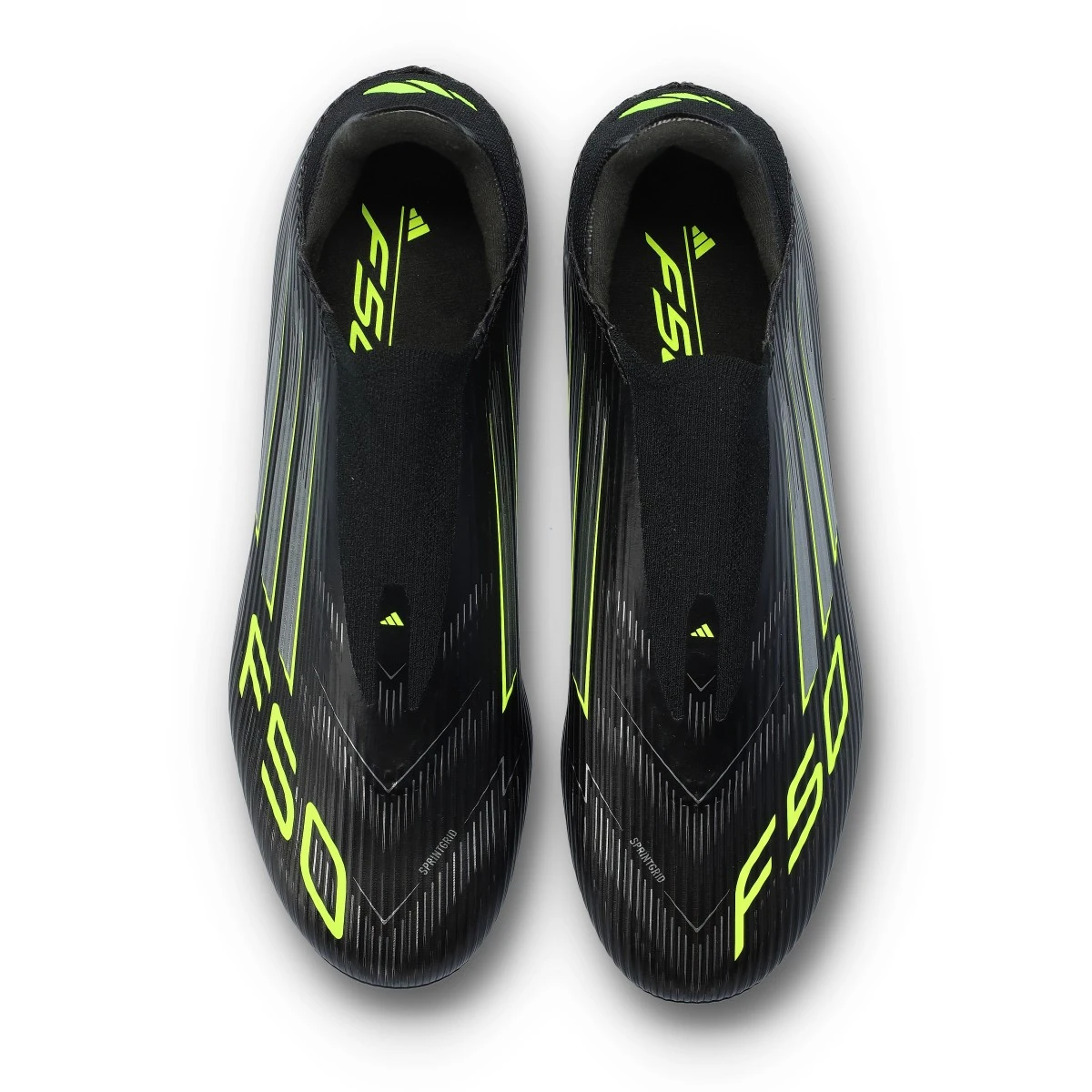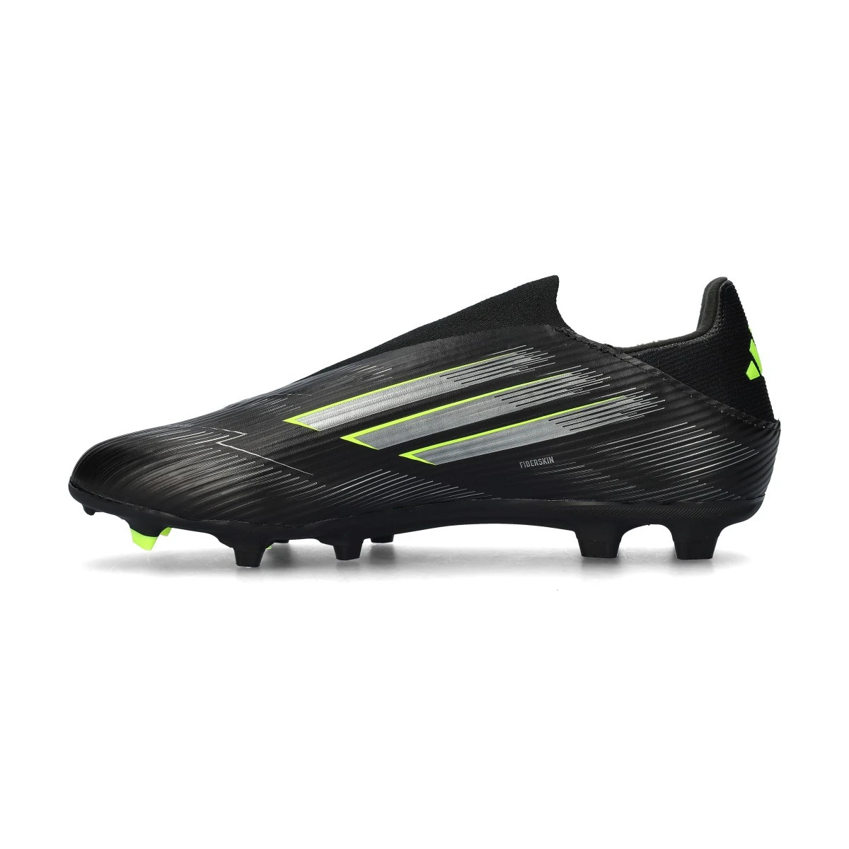 Chaussure F50 League LL FG/MG de la marque adidas en color Core Black-Iron Met-Lucid Lemon. Chaussure de gamme moyenne sans lacets, conçue pour les terrains en gazon naturel et gazon artificiel de deuxième génération.