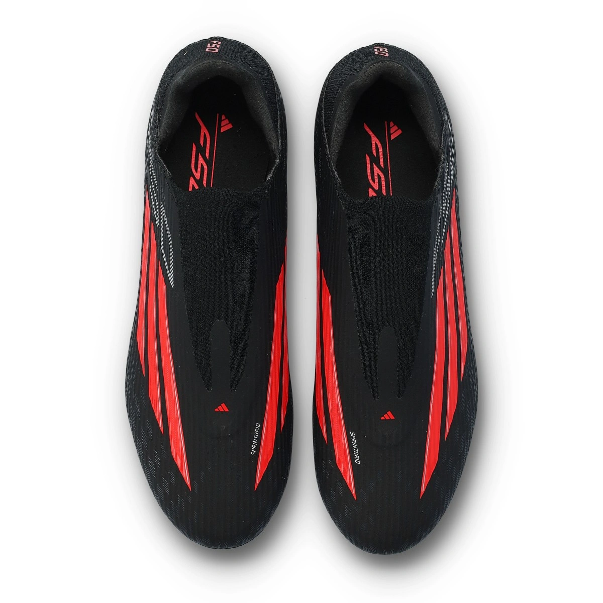 Chaussure F50 League LL FG/MG de la marque adidas en couleur Core Black-Lucid Red-Core Black. Chaussure d'entrée de gamme sans lacets pour terrains en gazon naturel et gazon artificiel de deuxième génération.