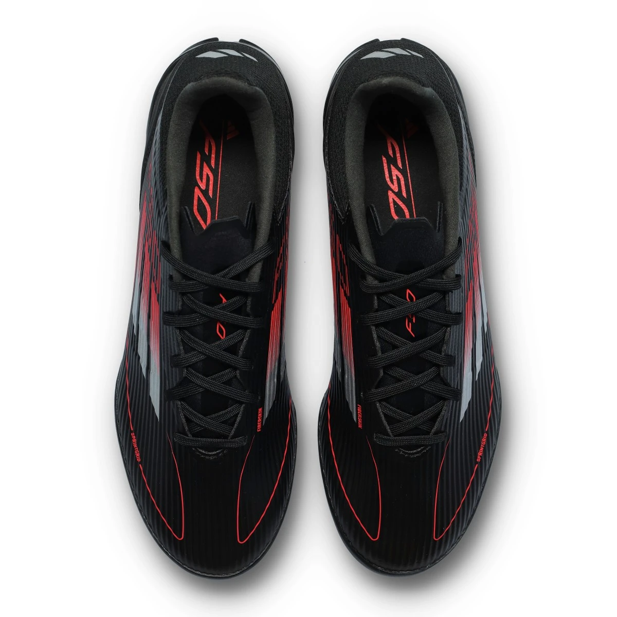 Chaussures F50 League Turf d'adidas, coloris Core Black Iron Met-Lucid Red. Chaussures de base pour les terrains en moquette ou en gazon artificiel.
