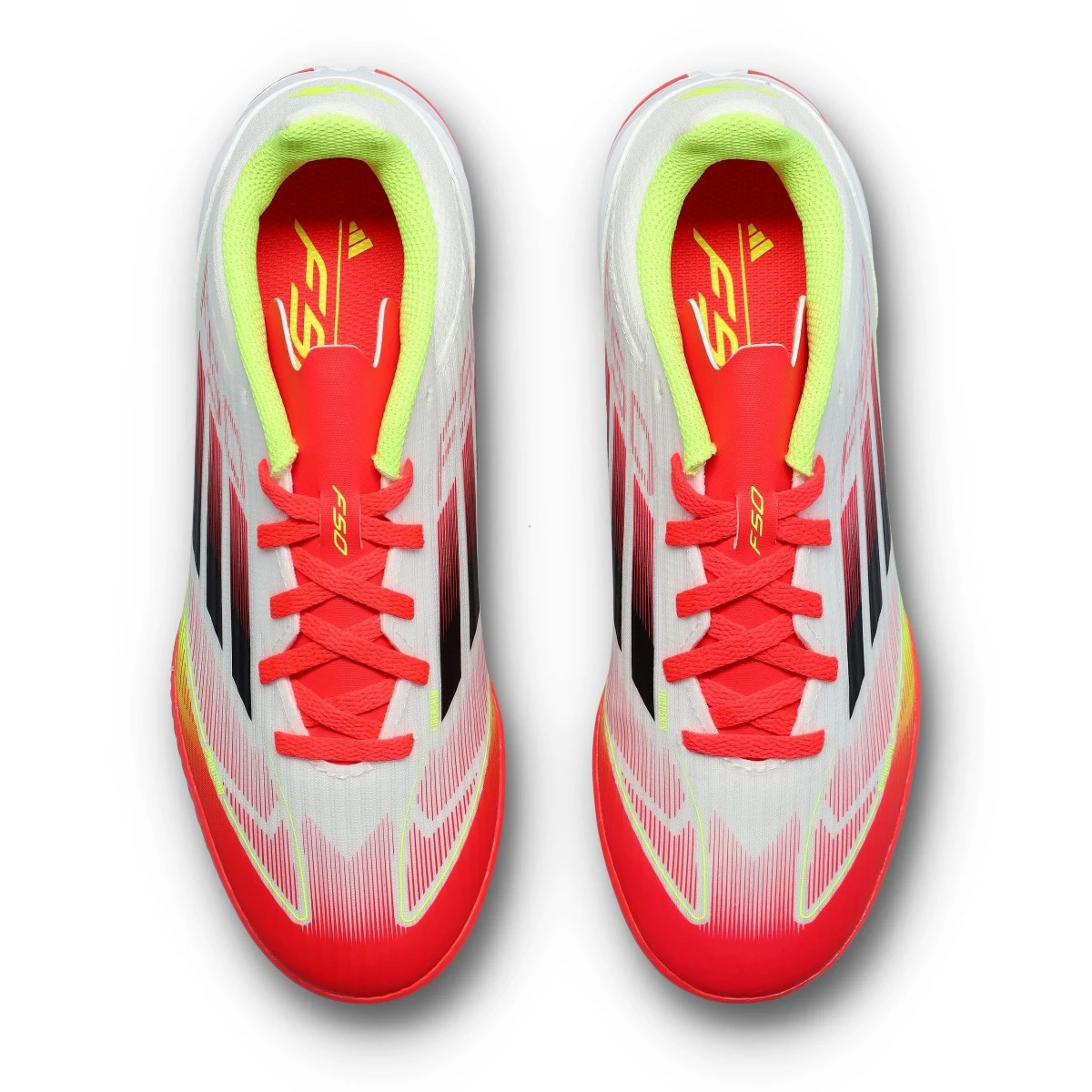 Chaussures F50 League Turf Kids d'adidas en Ftwr White-Core Black-Solar Yellow. Chaussure de base pour moquette ou gazon artificiel.