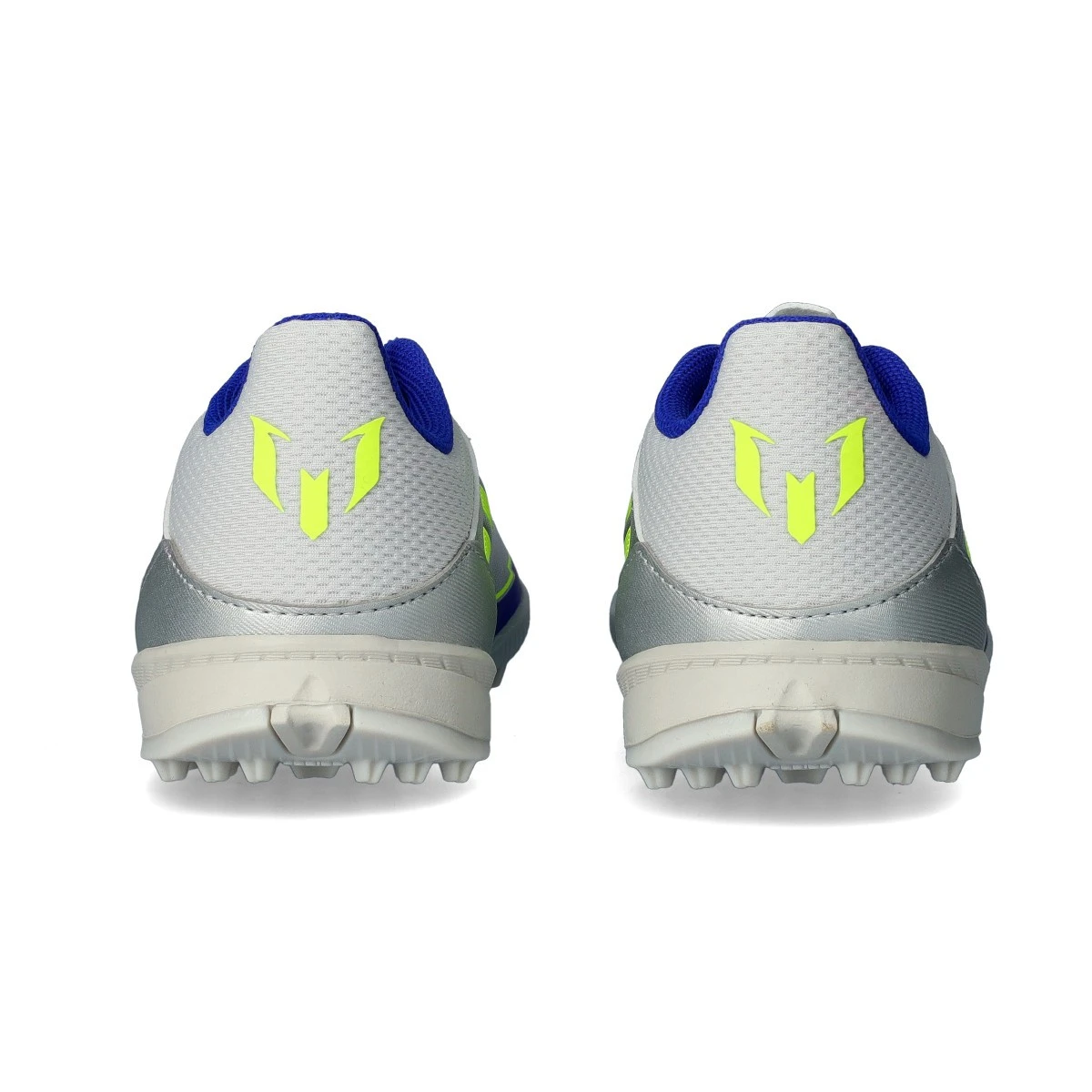 Chaussure adidas F50 League Turf Messi pour enfant en coloris Silver Met-Solar Yellow-Lucid Blue. Chaussure de base pour tapis.