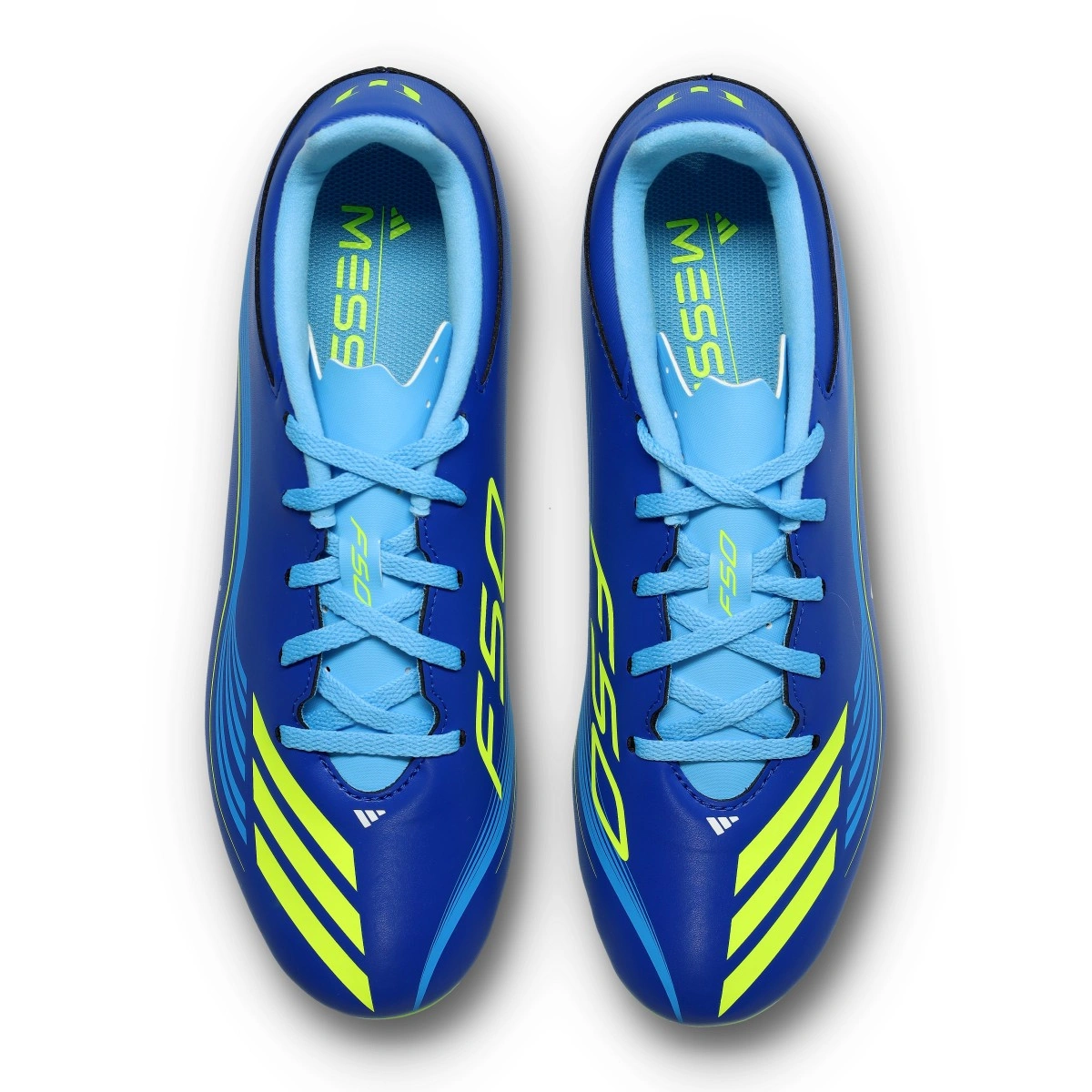 Chaussures adidas F50 Messi Club FG/MG en coloris Team Royal blue-Solar Yellow-Semi Blue Burst. Chaussure bas de gamme pour terrains en gazon naturel ou artificiel de première génération.