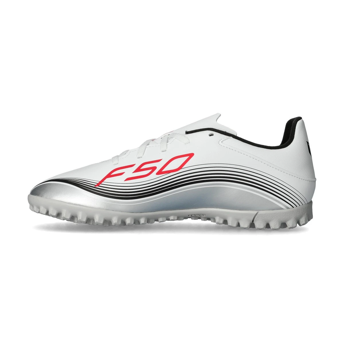 Chaussure adidas F50 Club Turf en blanc-rouge lucide-métal argenté. Chaussure de base pour les terrains en gazon artificiel.