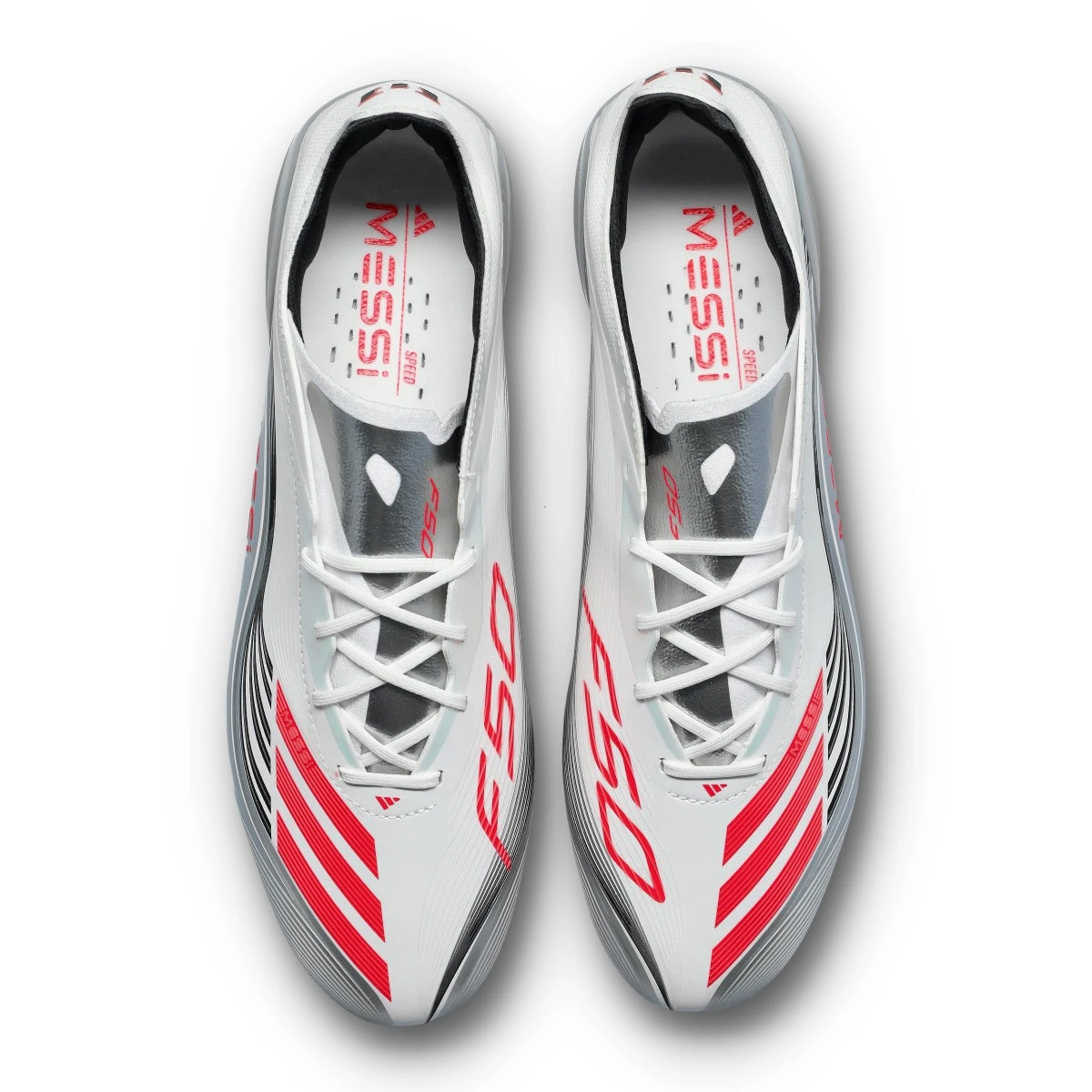 Chaussure adidas F50 Elite FG Messi en blanc-rouge limpide-métal argenté. Chaussure haut de gamme pour les terrains en gazon naturel sec ou légèrement humide.