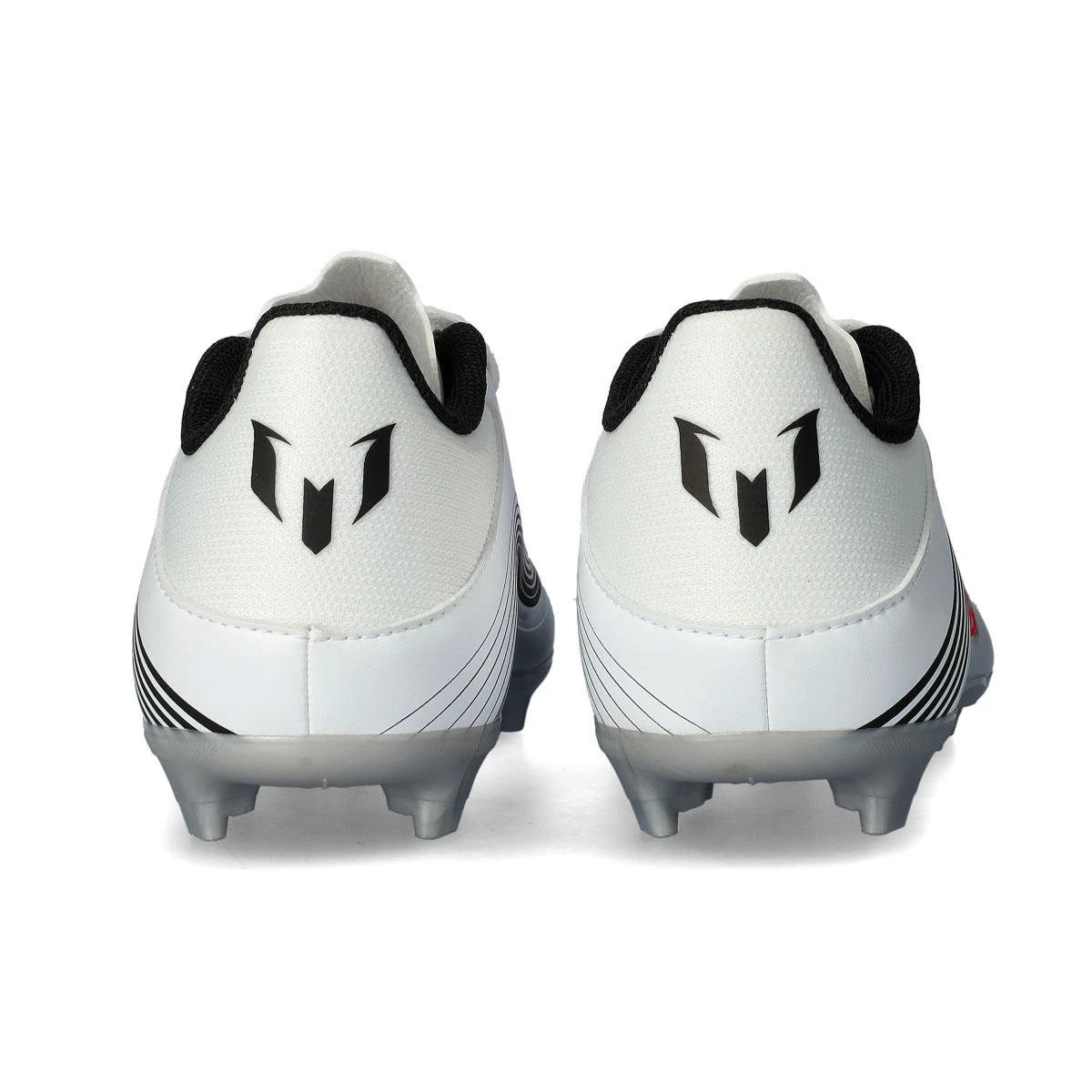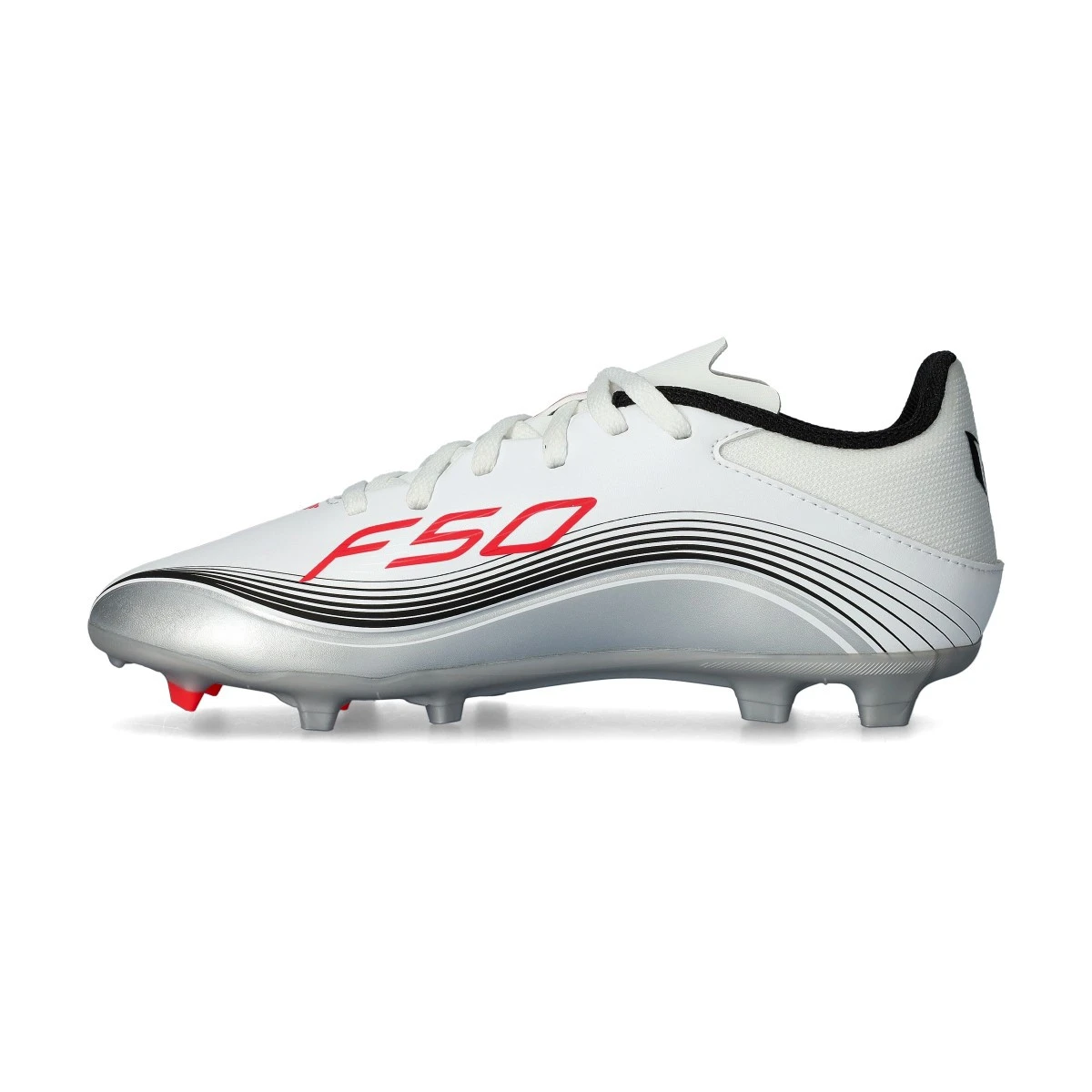 Chaussures F50 League FG/MG Messi pour enfants d'adidas en Ftwr White-Lucid Red-Silver Met. Chaussure haut de gamme pour les terrains en gazon naturel.