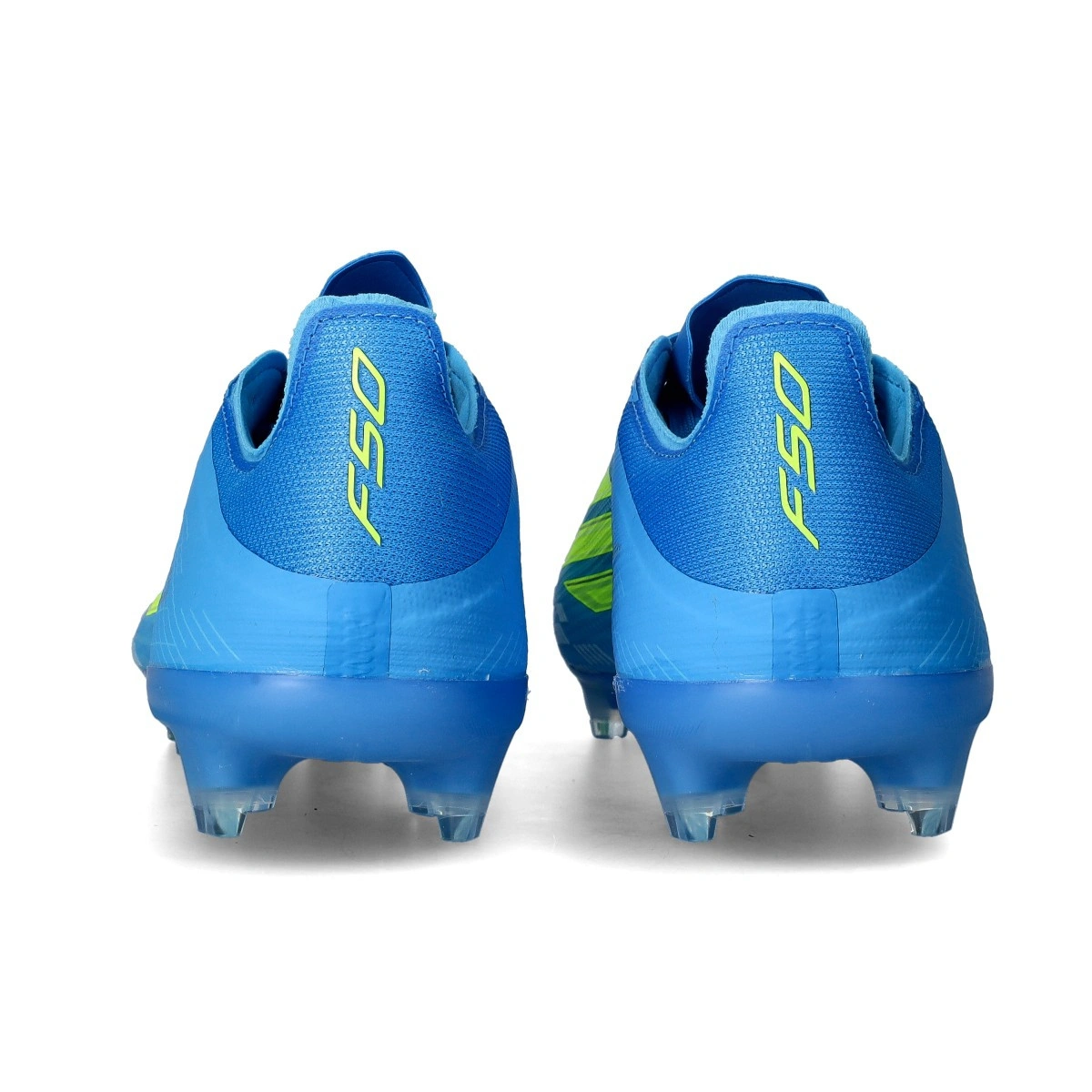 Chaussure F50 Pro FG de la marque adidas en couleur Lucid Ray Blue-Team Solar Yellow-Lucid Aqua. Chaussure de milieu de gamme pour terrains de gazon naturel.