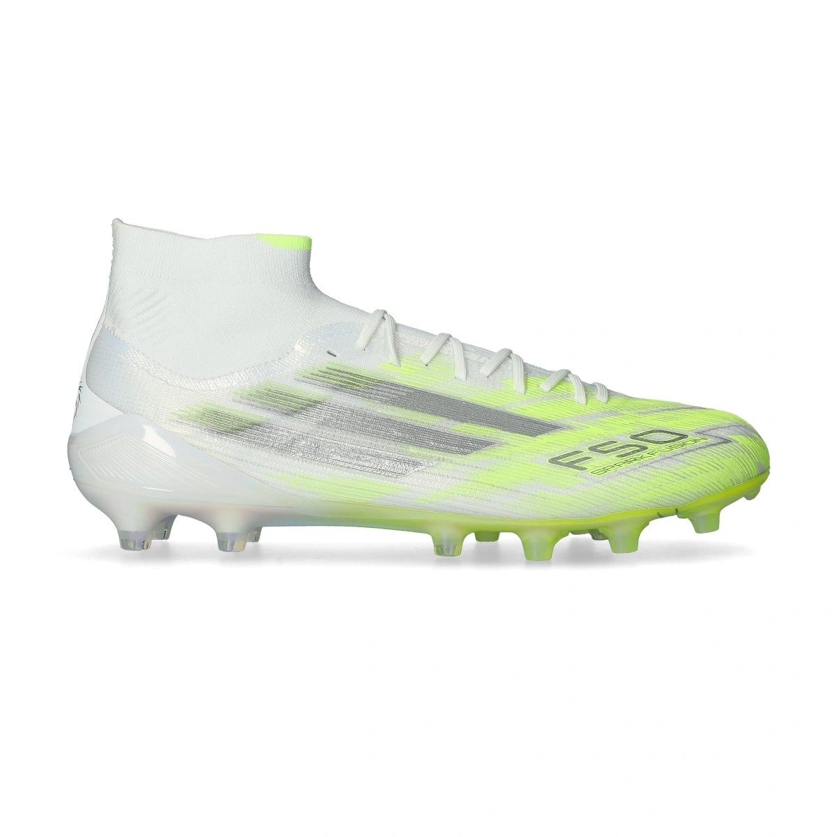 Chaussure de football adidas F50 Elite L FG/AG pour femme. Chaussures en knit avec lacets pour terrains en gazon naturel et gazon artificiel. Chaussures haut de gamme en coloris White-Iron Met-Hi-Res Yellowe.