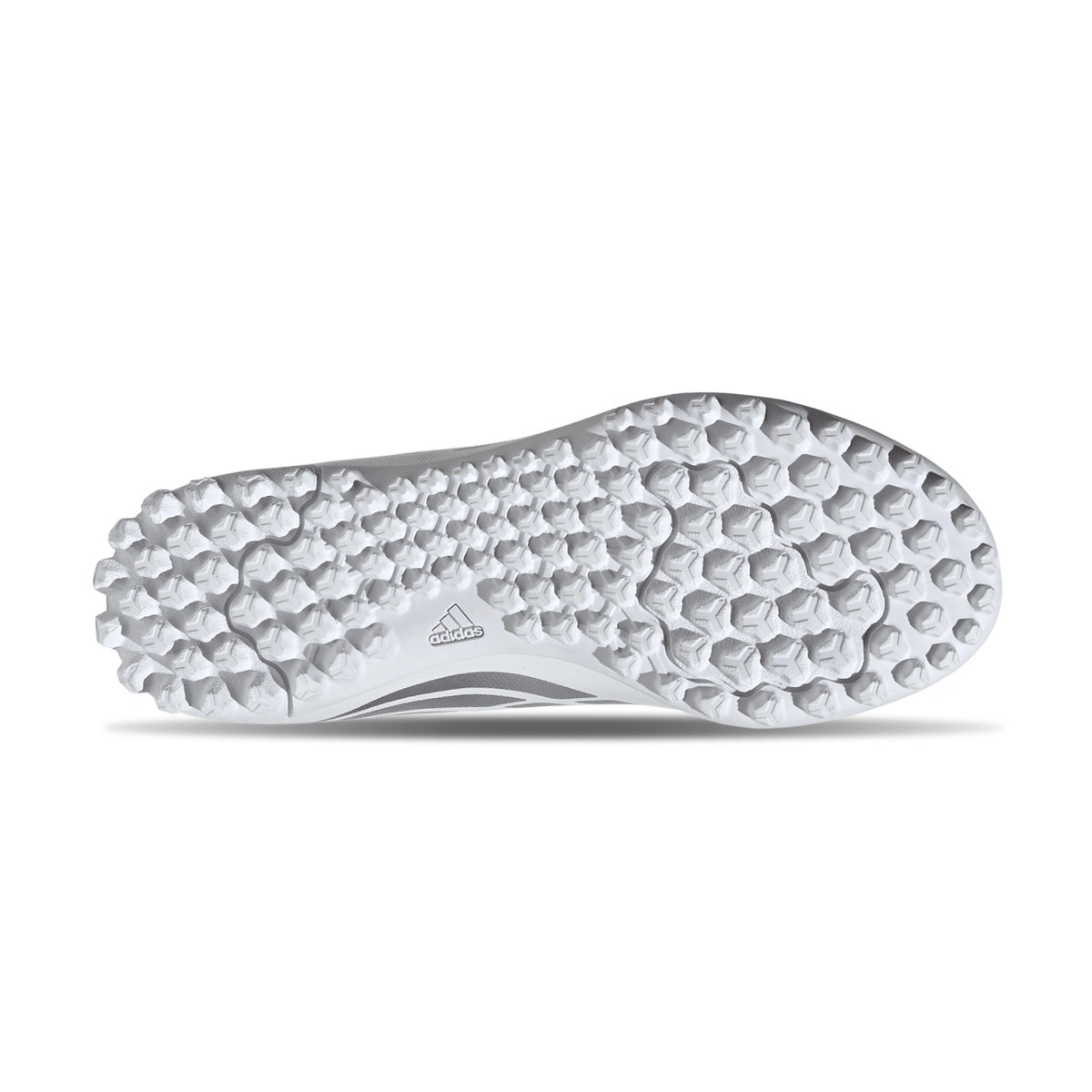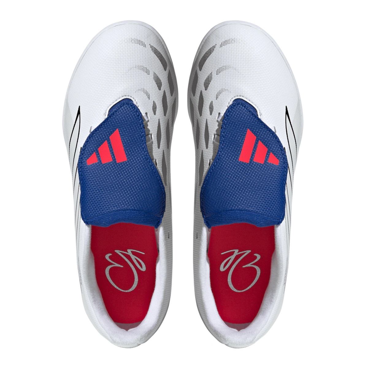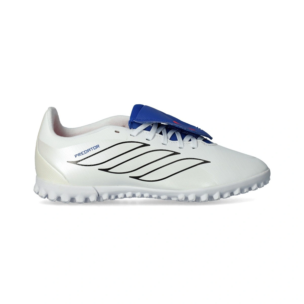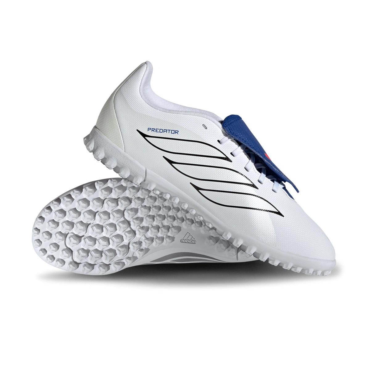 Chaussures de football adidas Predator Club Jude Bellingham FT Turf Enfant. Chaussures synthétiques avec languette pour une utilisation sur moquette ou terrains en gazon artificiel. Chaussures d'entrée de gamme en couleur White-Zero Met-Team Royal Blue