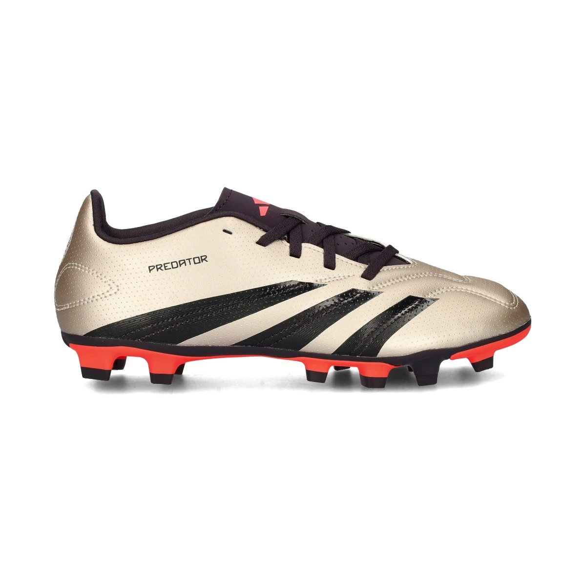 Chaussures de football adidas Predator Club L FG/MG. Chaussures synthétiques à utiliser sur des terrains en gazon naturel secs ou humides. Chaussures bas de gamme en couleur Platin Met-Aurora Black-Turbo. Pour les joueurs de contrôle.