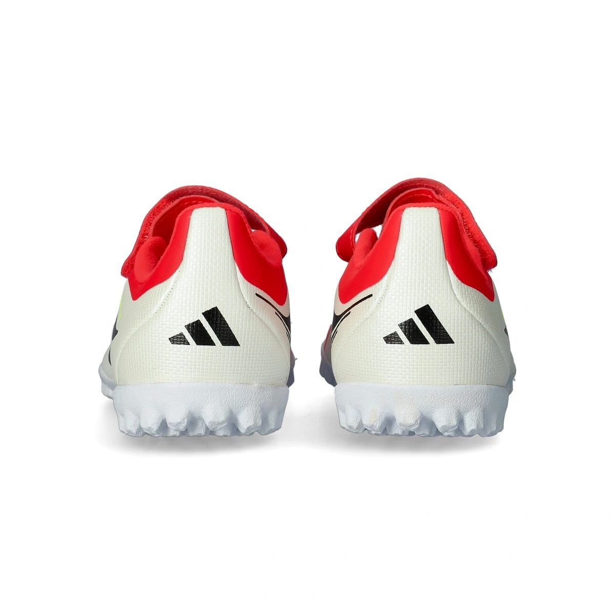 Chaussure de football adidas Predator Club Turf pour enfant. Chaussures synthétiques avec lacets pour terrains en terre ou moquette. Chaussures d'entrée de gamme en couleur Lucid Red-Core Black-White.