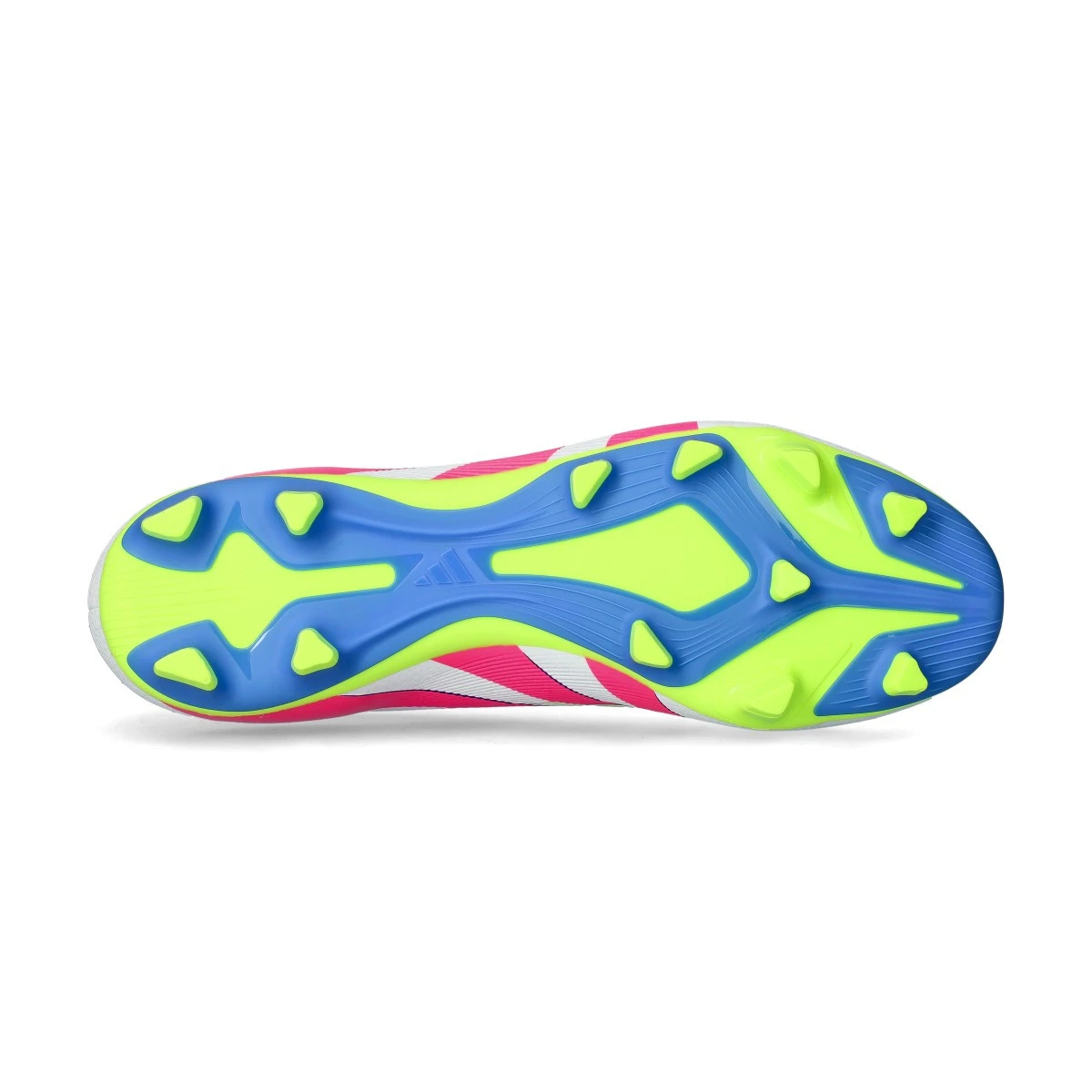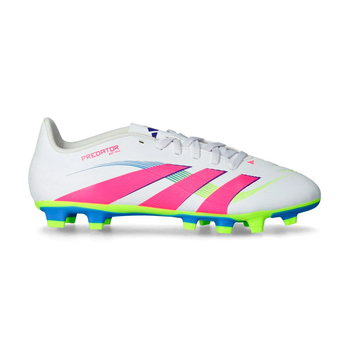 Chaussures de football adidas Predator Club L FG/MG. Chaussures synthétiques à utiliser sur des terrains en gazon naturel secs ou humides. Chaussures bas de gamme en blanc-rose lucide-citron lucide. Pour les joueurs de contrôle.