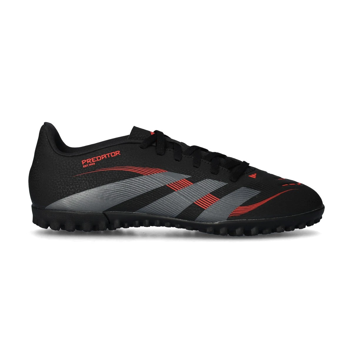 Chaussures de football adidas Predator Club L Turf. Chaussures synthétiques à lacets pour utilisation sur terrains en terre battue ou en moquette. Coloris Core Black-Grey Four-Lucid Red.