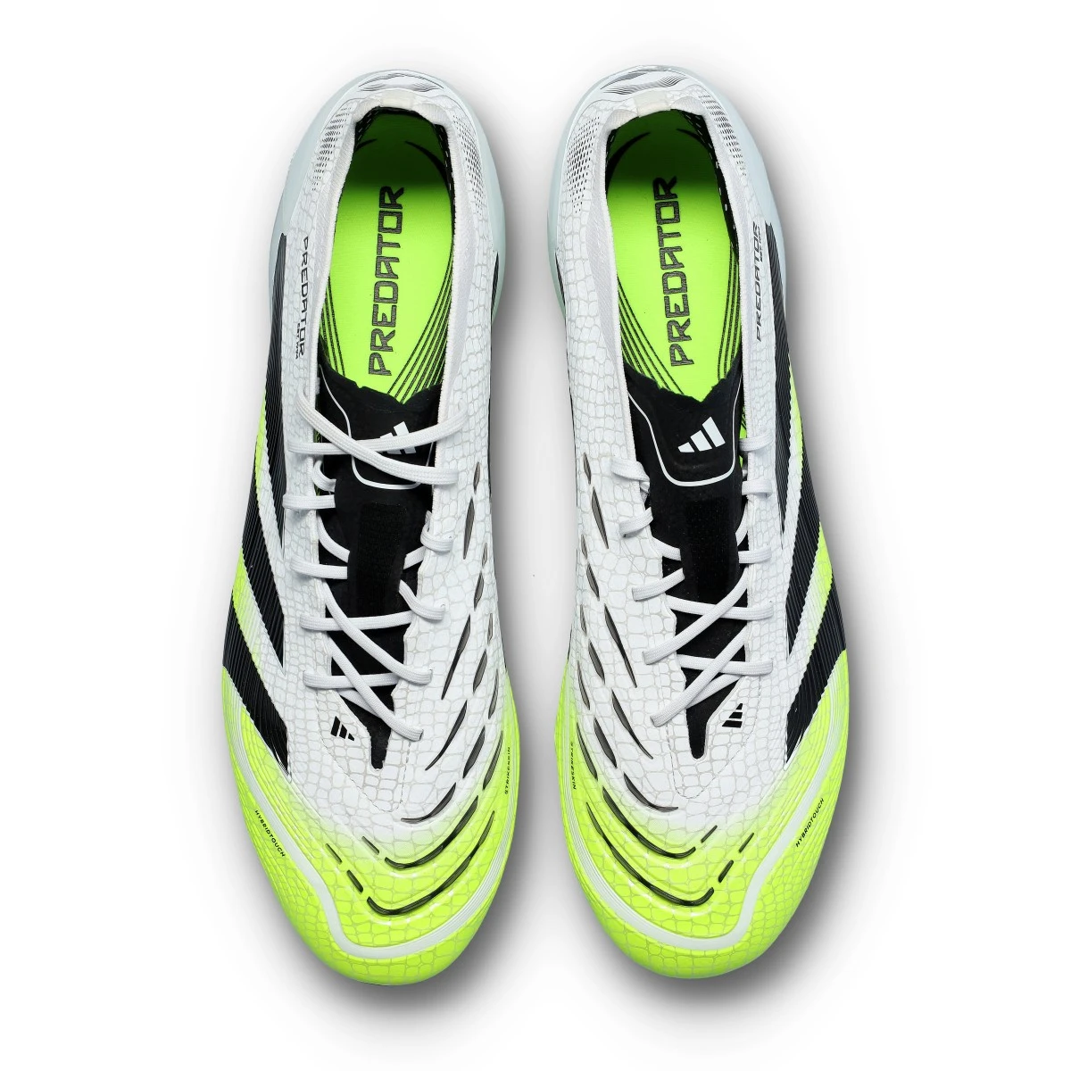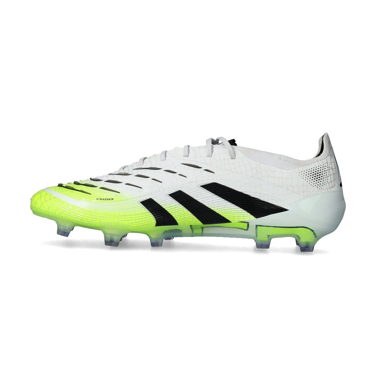 Chaussure de football adidas Predator Elite L FG pour adultes. Chaussures synthétiques à lacets, conçues pour jouer sur terrains en herbe naturelle. Modèle haut de gamme en coloris White-Core Black-Lucid Lemon.