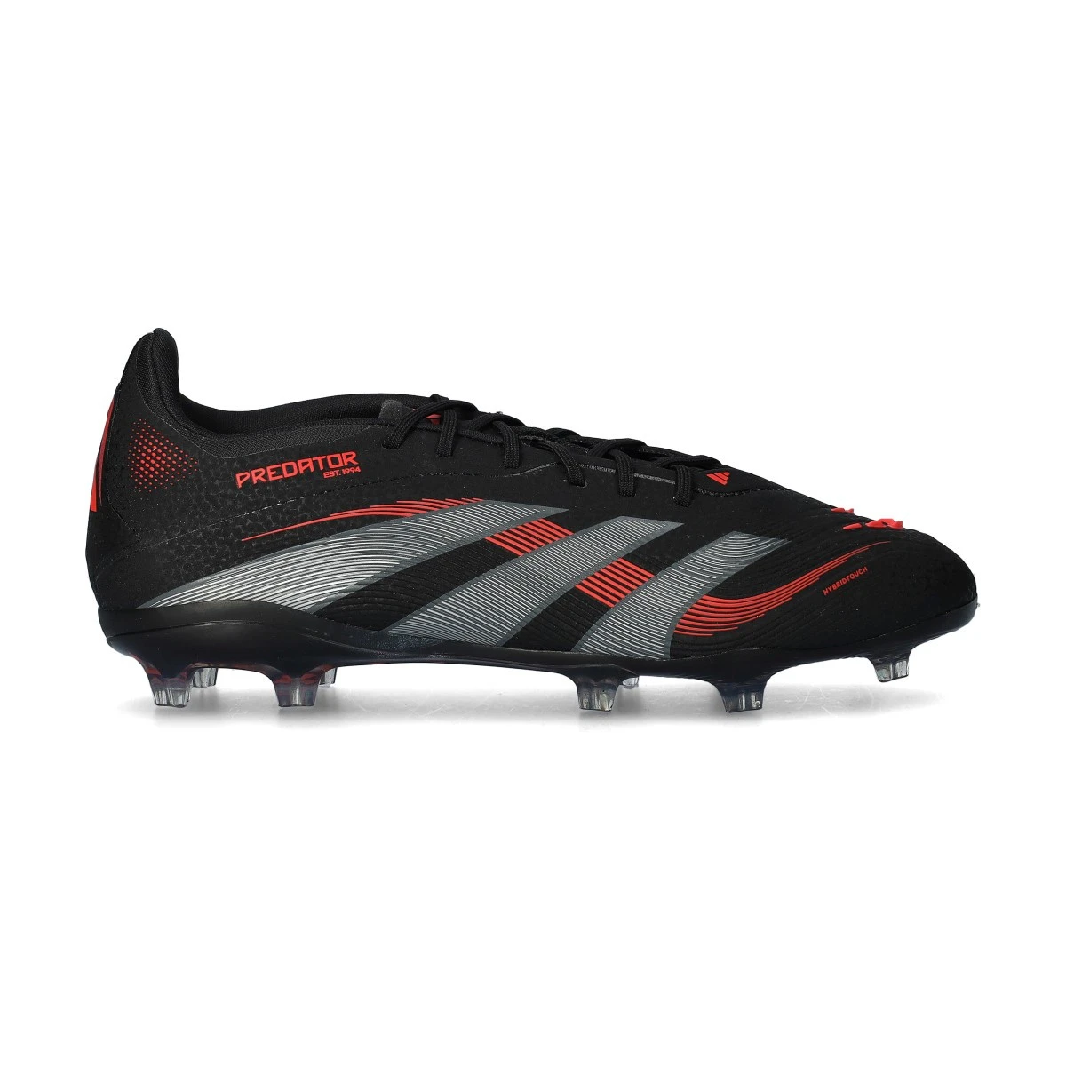 Chaussures de football adidas Predator Elite Low FG pour enfants. Chaussures synthétiques avec lacets pour utilisation sur terrains en gazon naturel. Chaussures haut de gamme en couleur Core Black-Grey Four-Lucid Red.