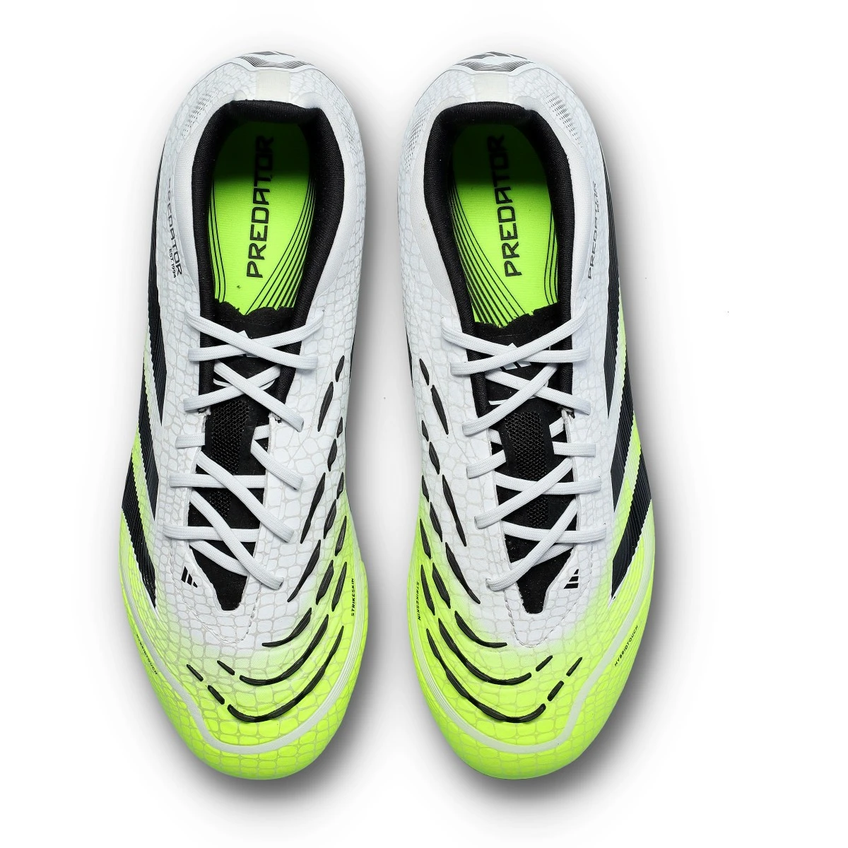 Chaussure de football adidas Predator Elite L FG pour enfant. Chaussures synthétiques à lacets conçues pour jouer sur terrains en gazon naturel. Modèle haut de gamme en White-Core Black-Lucid Lemon.