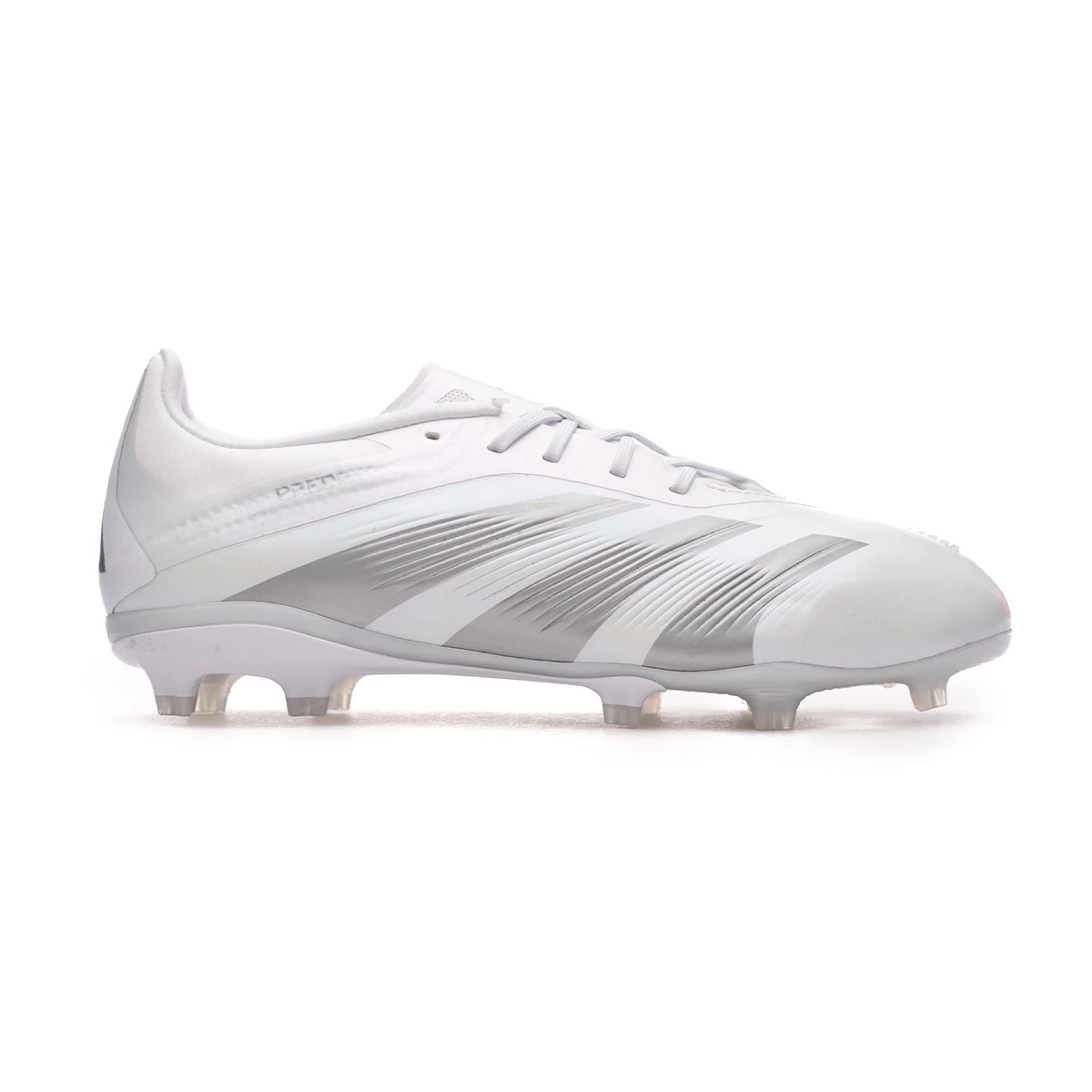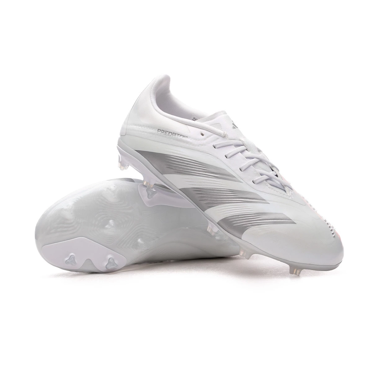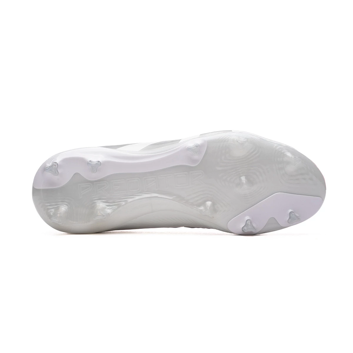 Chaussure de football adidas Predator Elite FG pour enfants. Chaussures synthétiques sans lacets à utiliser sur les terrains d’herbe naturelle. Chaussures haut de gamme en blanc.