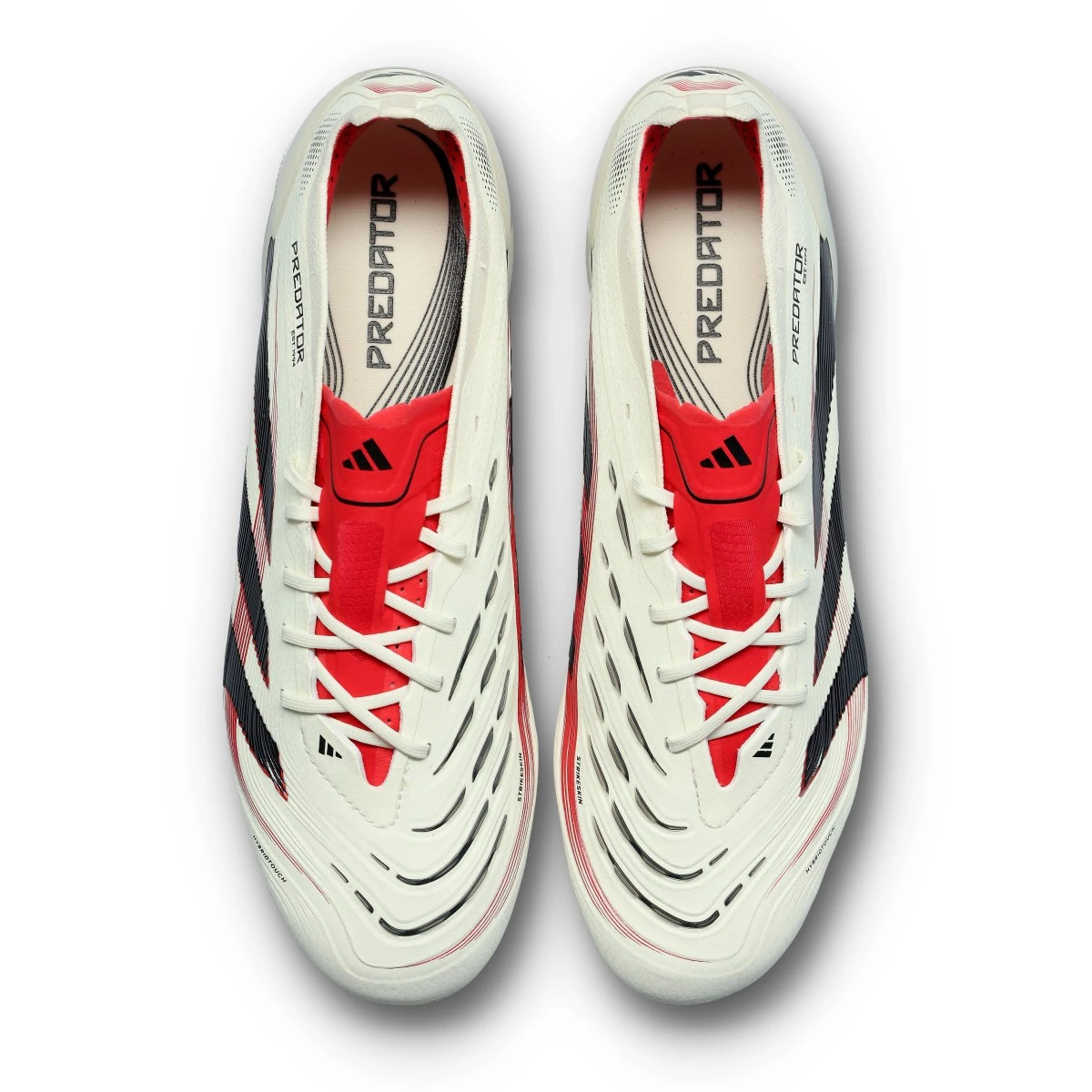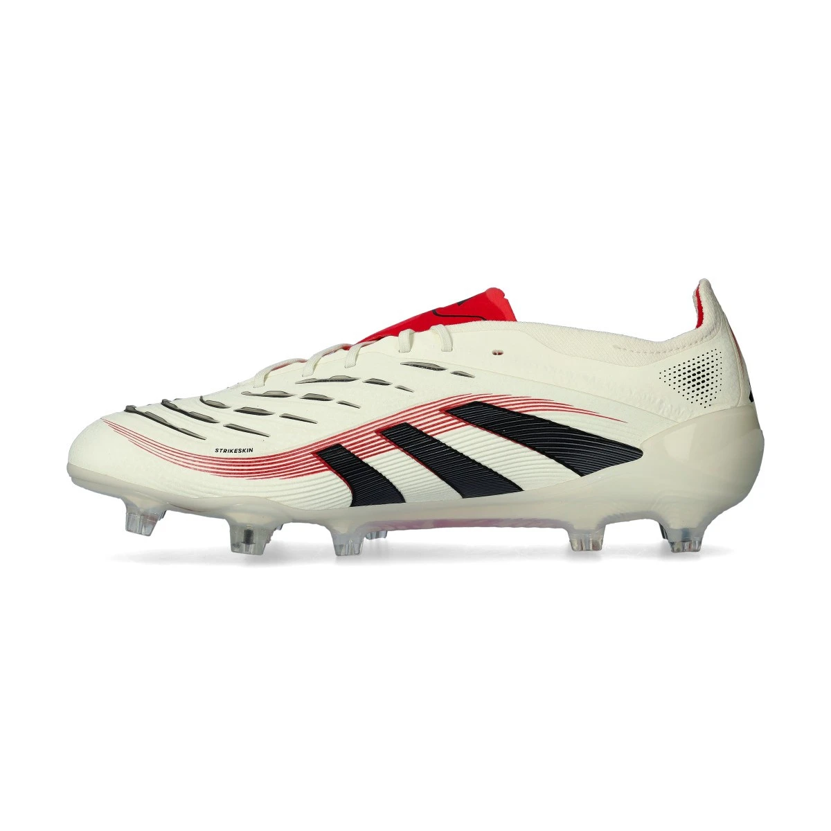 Chaussures de football adidas Predator Elite L FG pour adultes. Modèles synthétiques à lacets pour utilisation sur terrains en gazon naturel. Chaussures haut de gamme en Off White-Core Black-Pure Ruby.